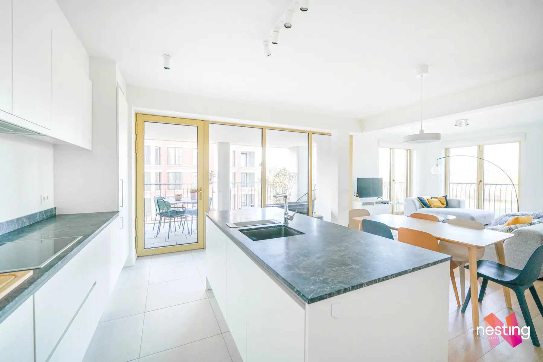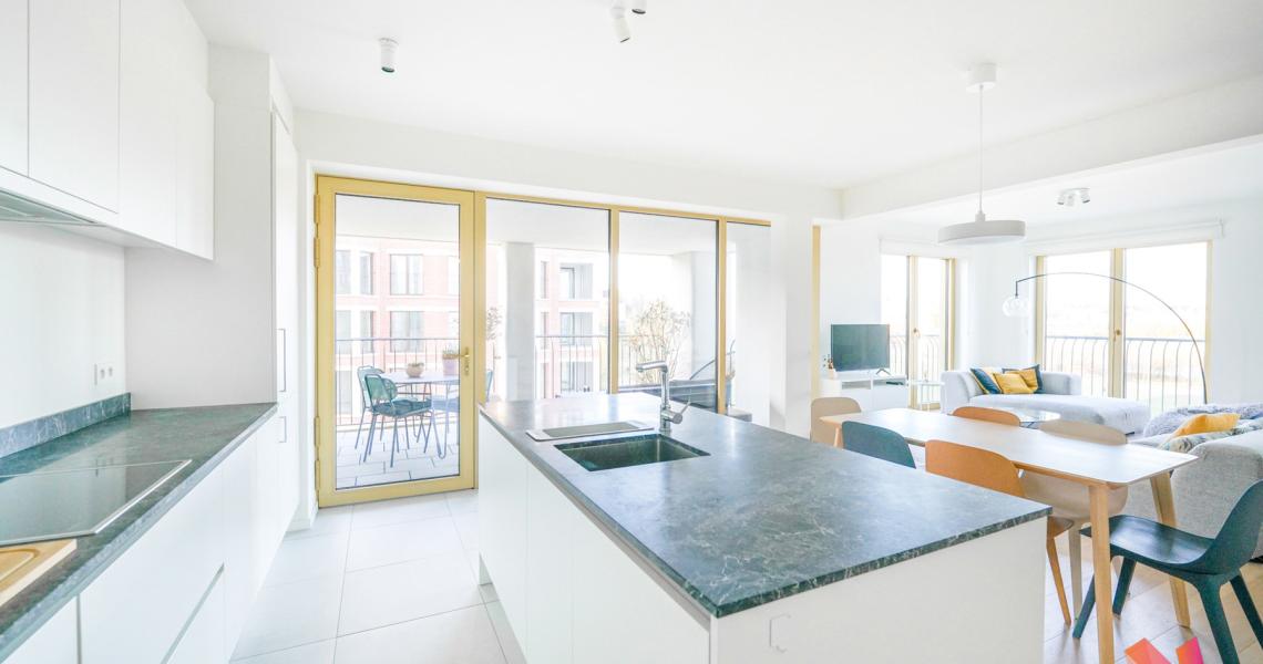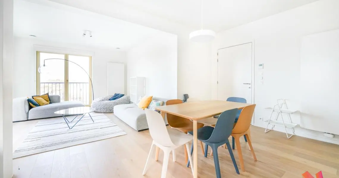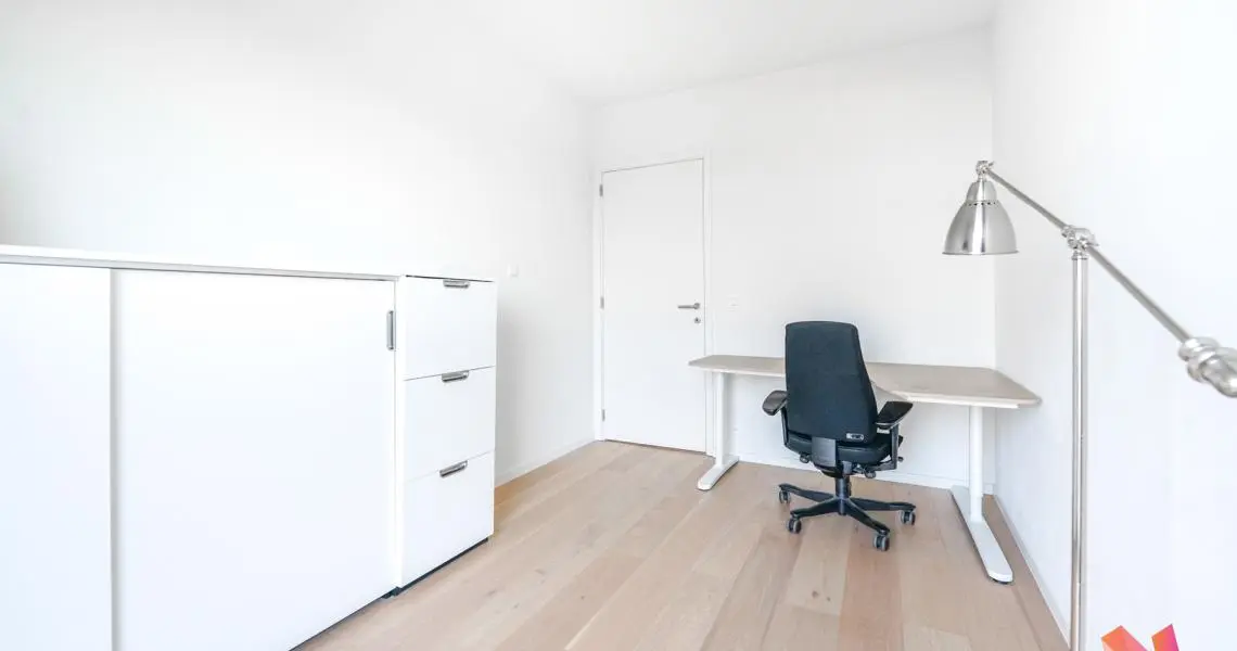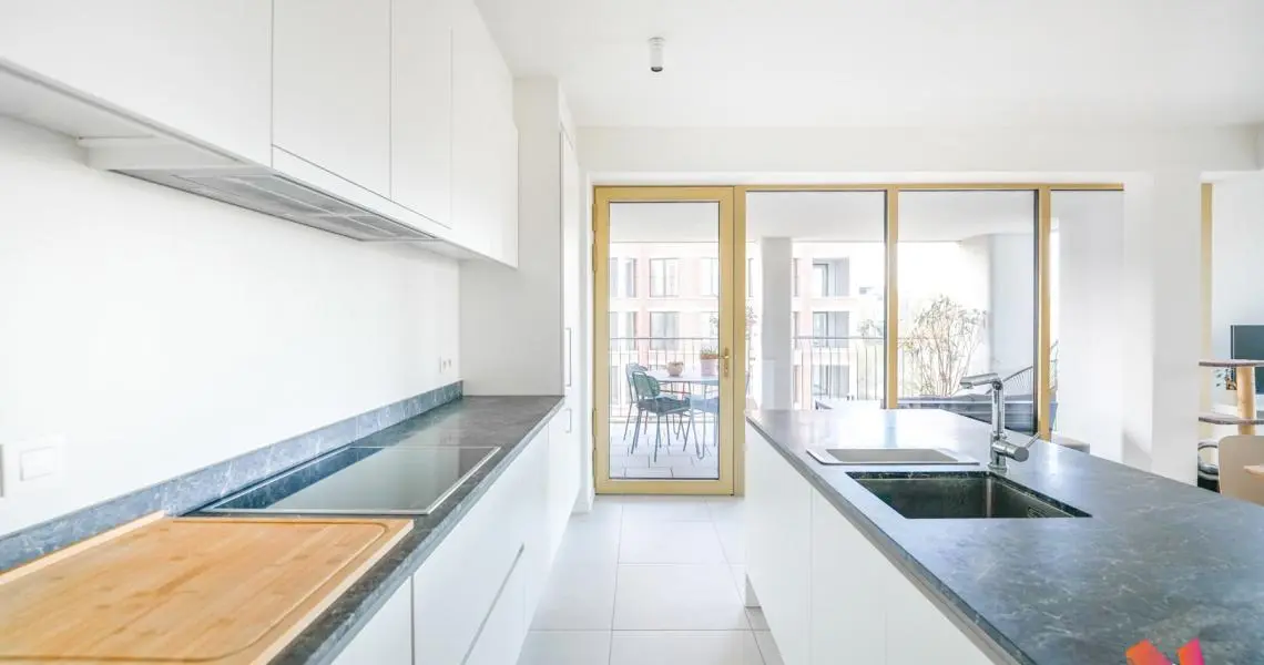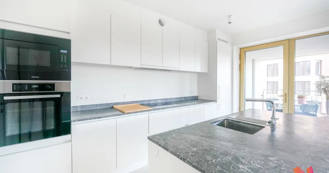 Un hall d'entrée, 3 chambres de +-15,5m2, +-11,5m2 et +-10m2 dont une avec une salle de bains privative et un dressing, une salle de douche, un grand séjour de +-45m2 avec une cuisine américaine super équipée et donnant accès à une terrasse de +-13m2.