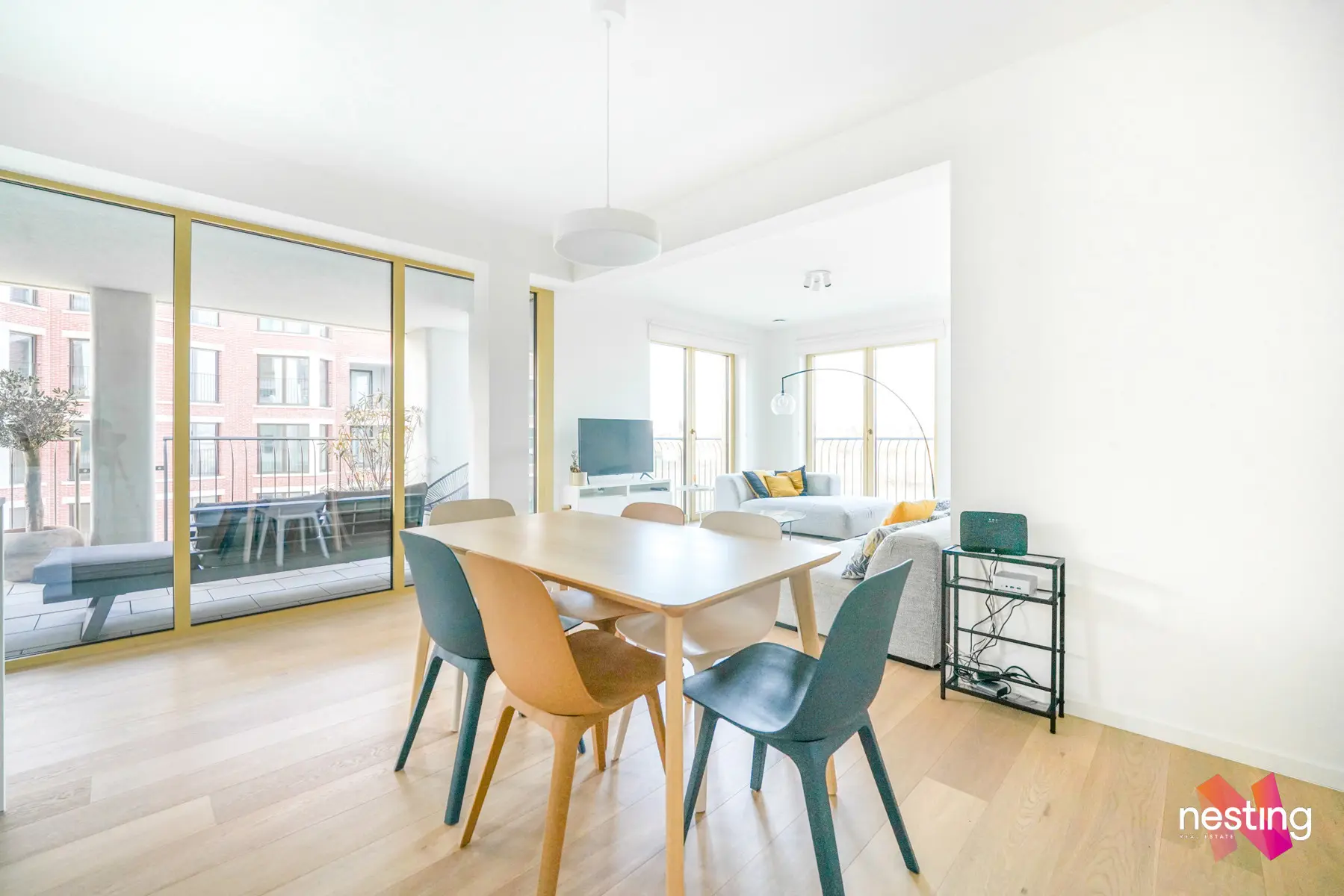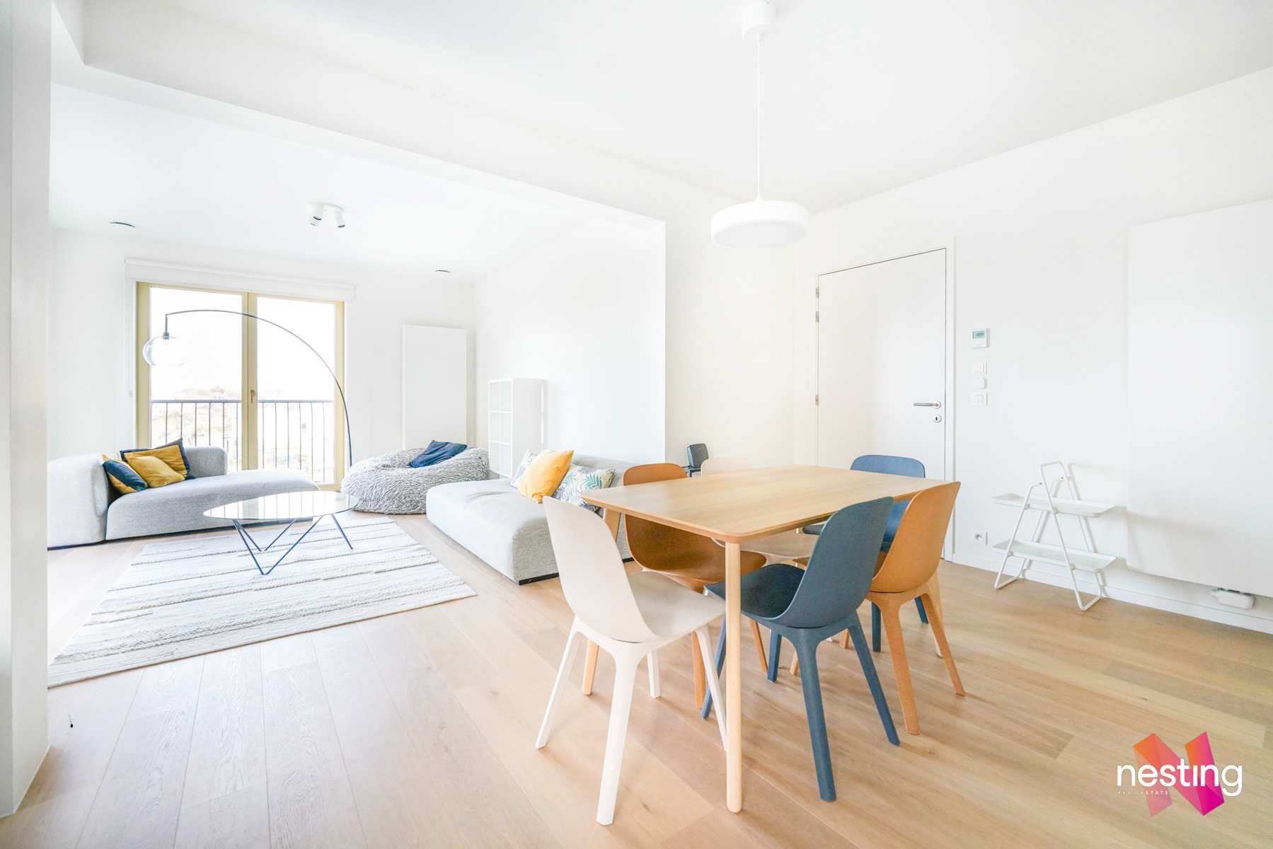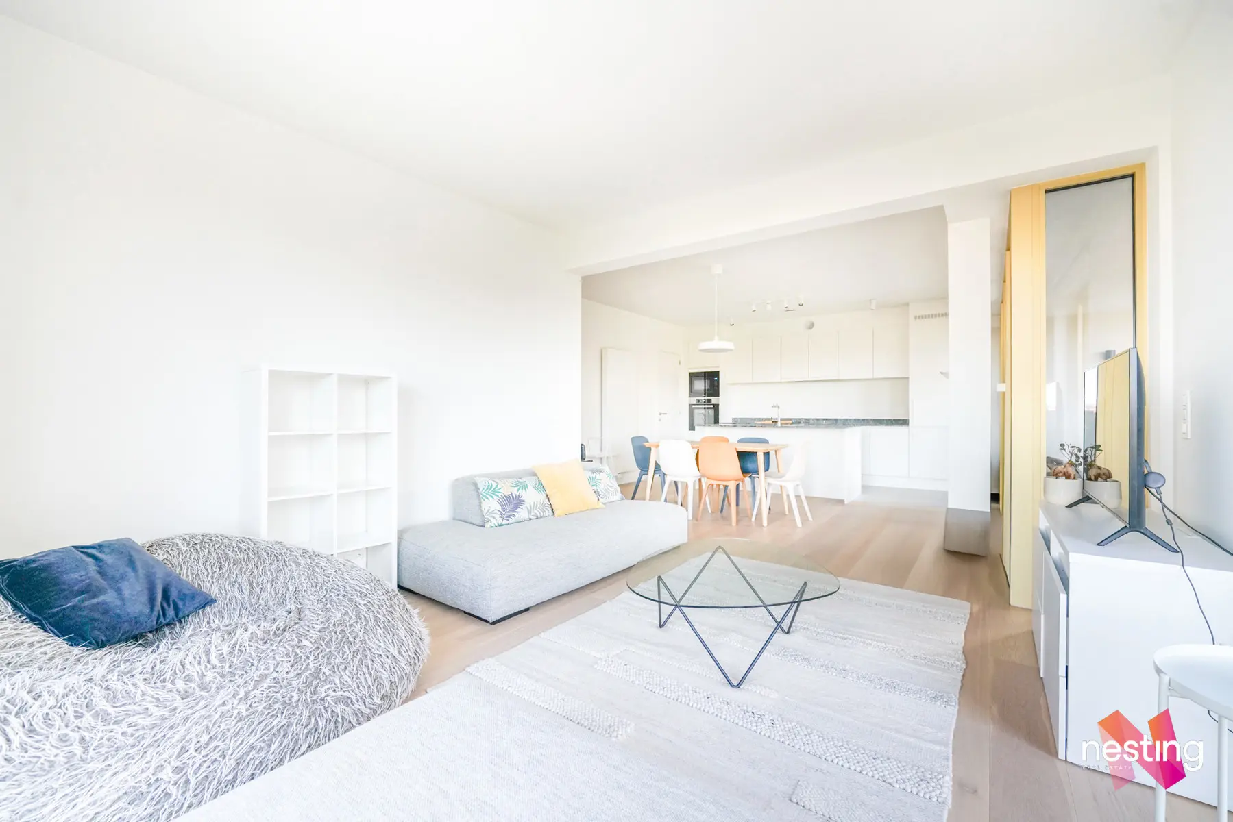 Un hall d'entrée, 3 chambres de +-15,5m2, +-11,5m2 et +-10m2 dont une avec une salle de bains privative et un dressing, une salle de douche, un grand séjour de +-45m2 avec une cuisine américaine super équipée et donnant accès à une terrasse de +-13m2.