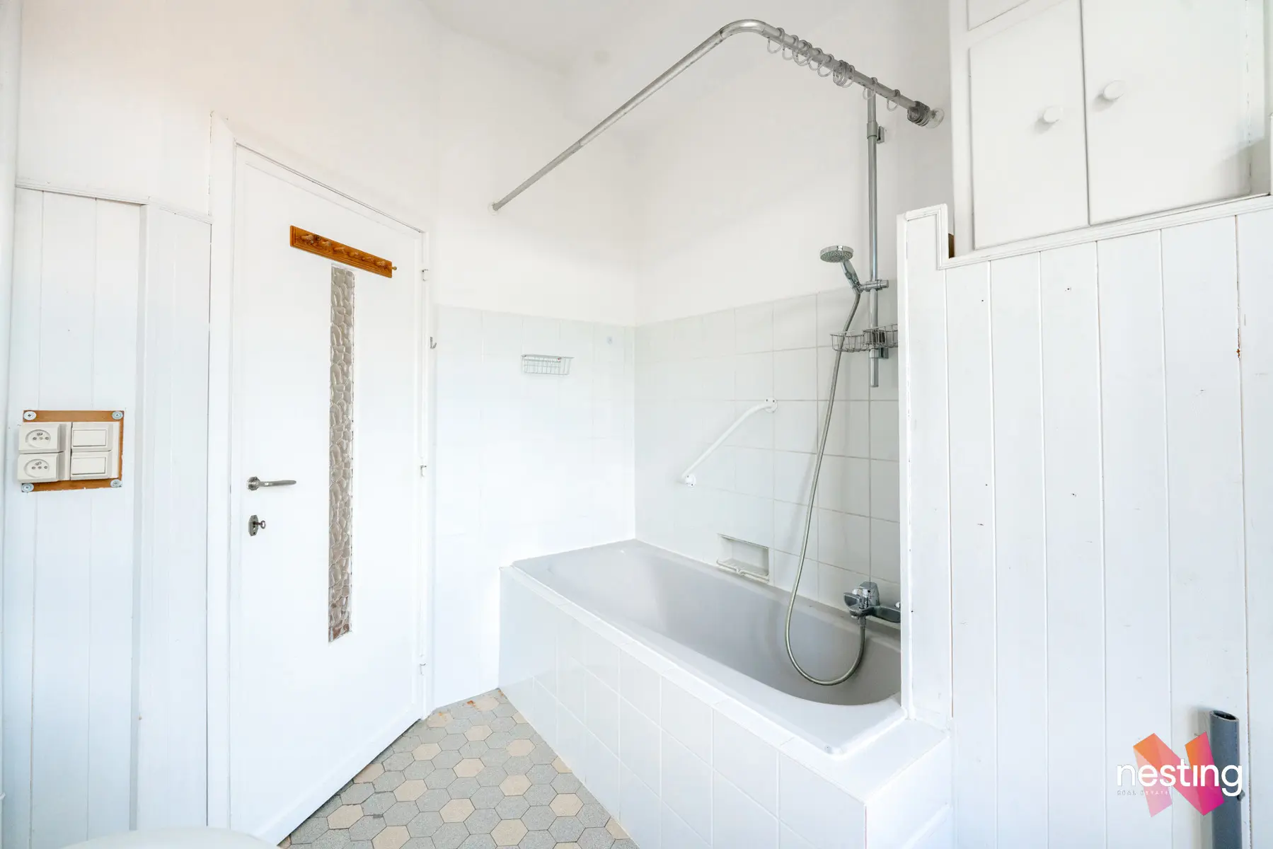 L'appartement se compose comme suit : un hall d'entrée avec vestiaire et wc séparé, un magnifique séjour de +- 45m2 (actuellement divisé pour en faire une 3e chambre), une cuisine fermée spacieuse donnant sur petite terrasse, un hall de nuit, 2 chambres (+-14m2 et +-16m2 ) et une salle de bains.