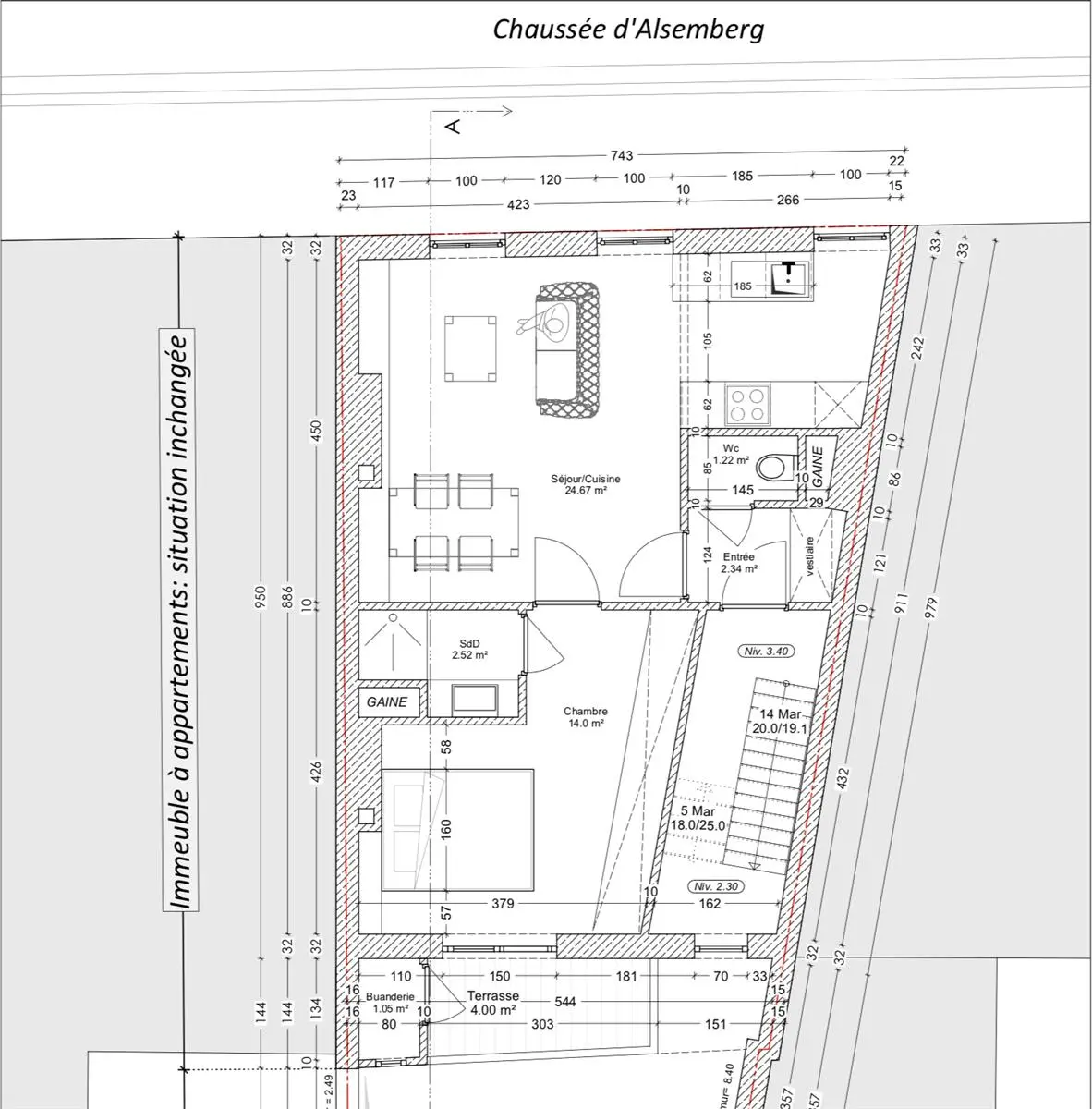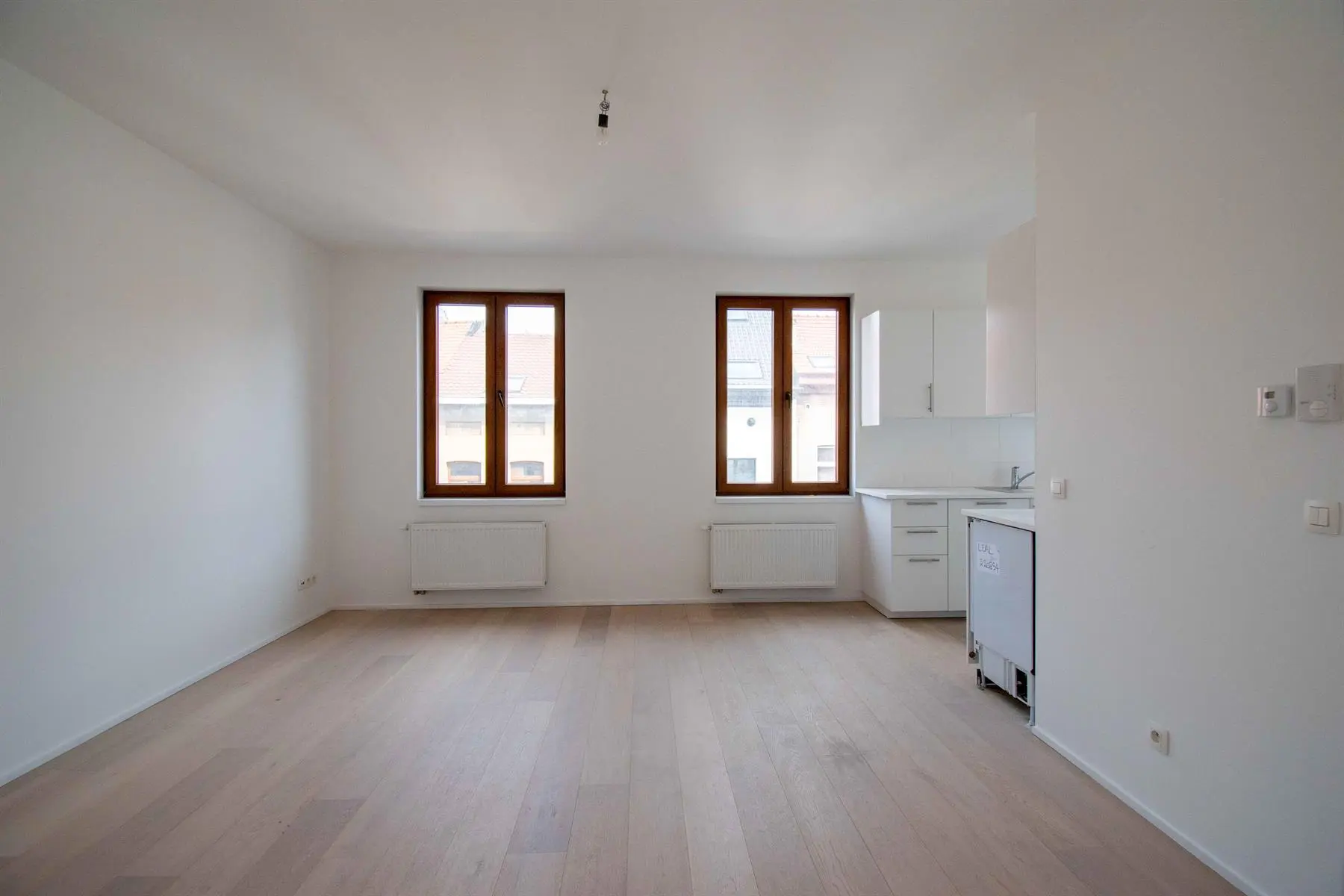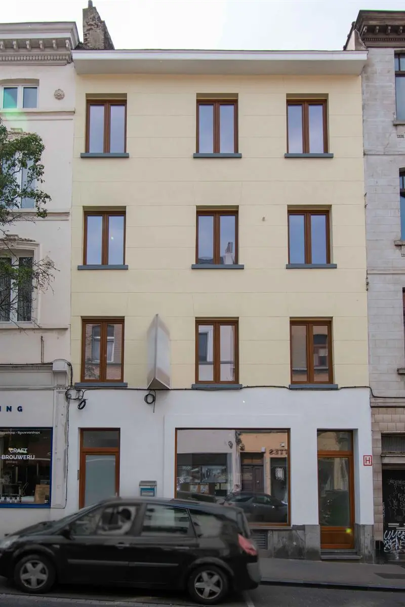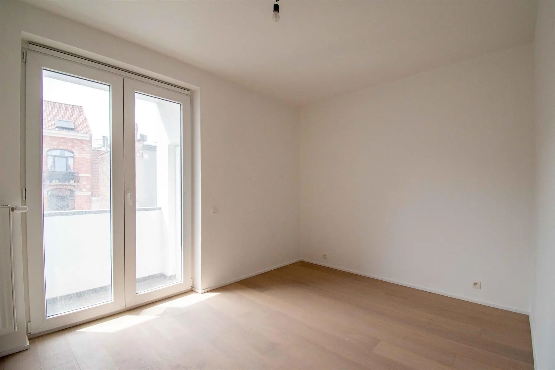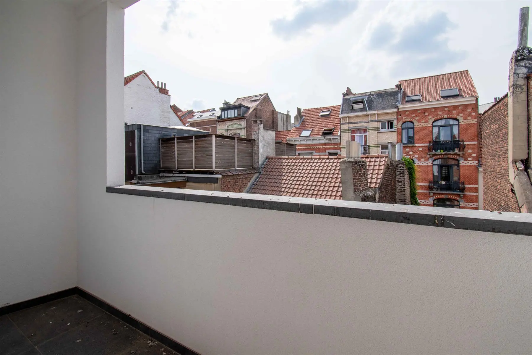 Saint-Gilles, à proximité immédiate de la place Van Meenen, des commerces et des transports en communs, dans un immeuble entièrement rénové (1ere occupation), superbe appartement au 3ème et dernier étage, parquet partout, lumineux et offrant : hall d'entrée avec vestiaire et wc séparé, beau séjour, cuisine Us équipée, 1 chambre de +- 14m², salle de douche, wc séparé, terrasse arrière de +- 4 m².