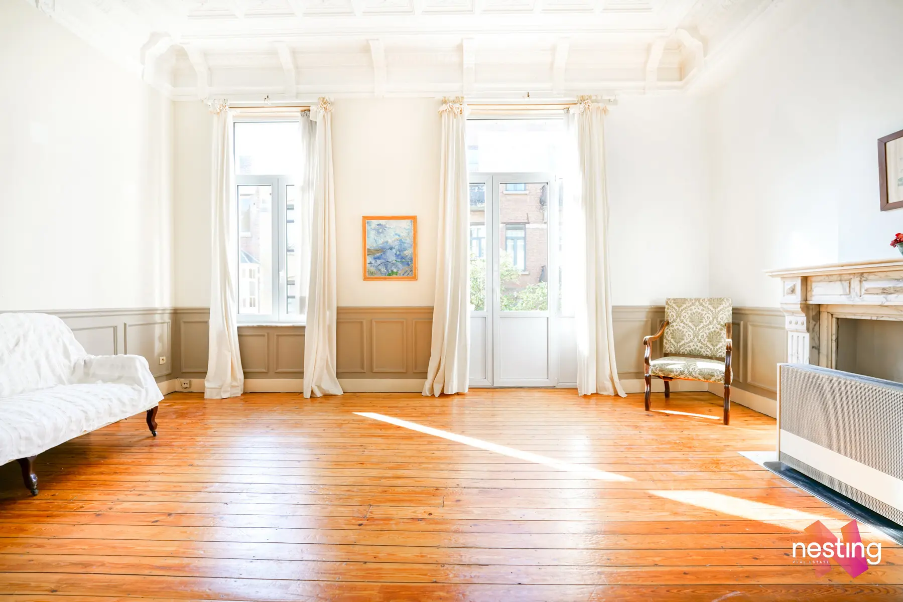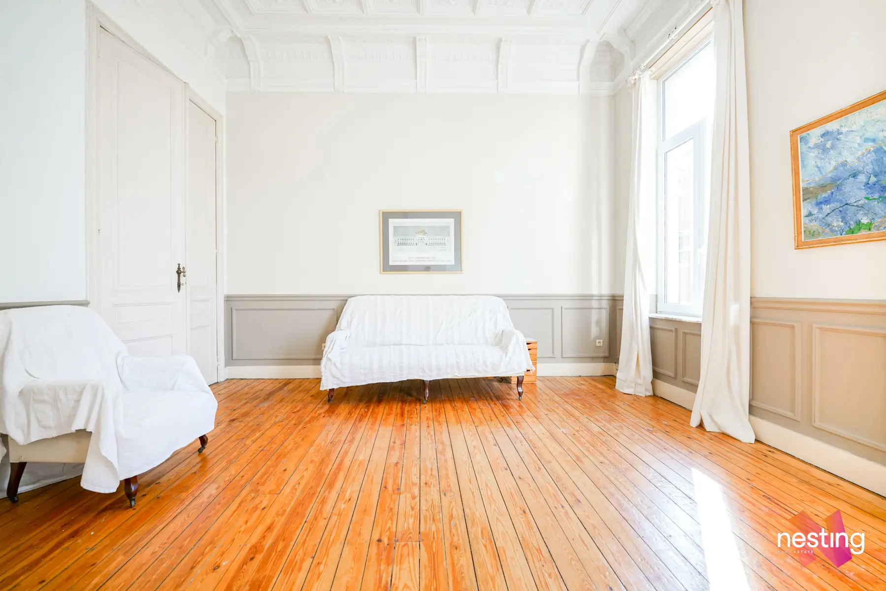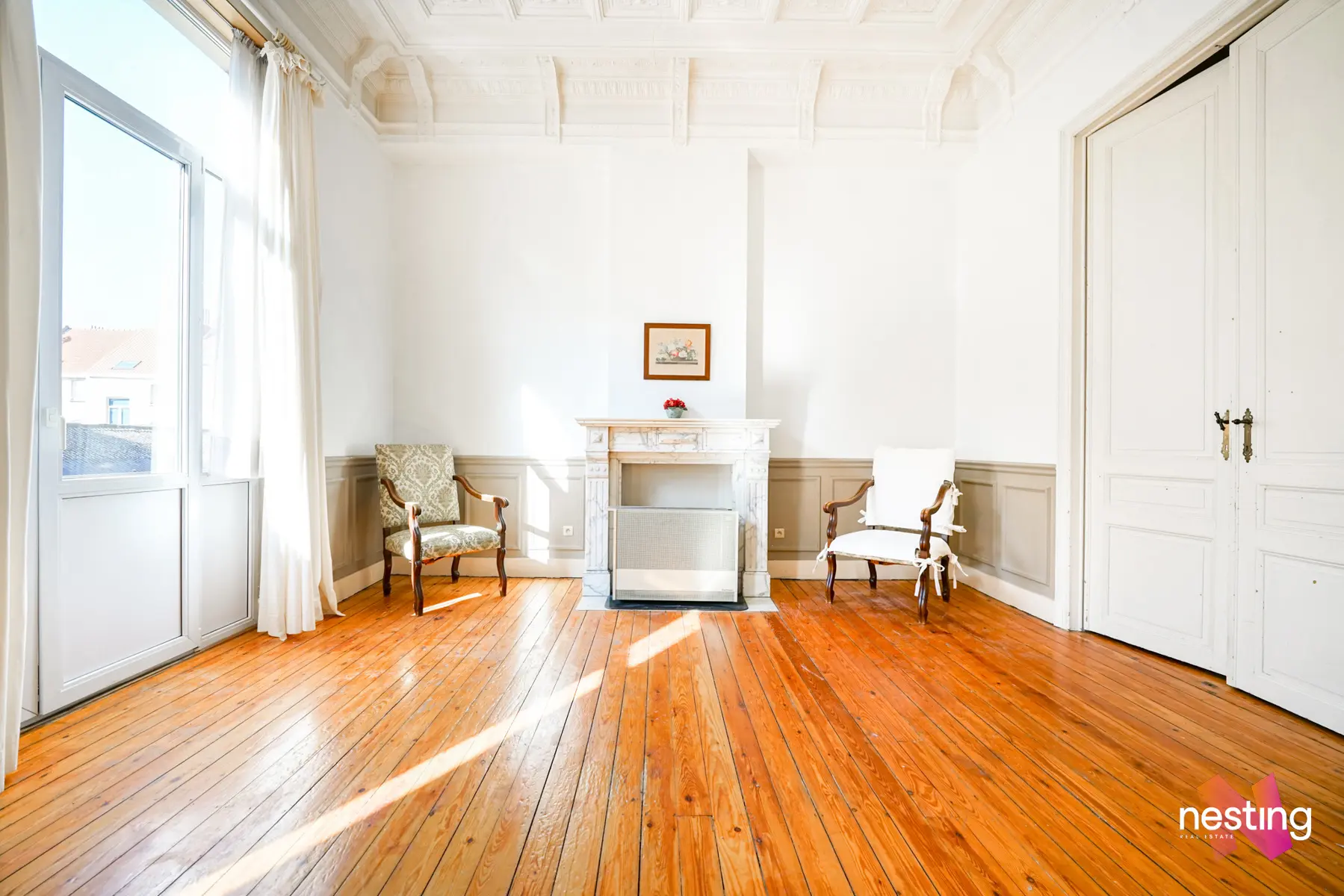 Un grand salon de près de 30 m². Ce vaste espace est agrémenté de magnifiques moulures au plafond, ajoutant une touche d'élégance et de caractère. Le salon s'ouvre sur un balcon, parfait pour profiter de l'air frais.
