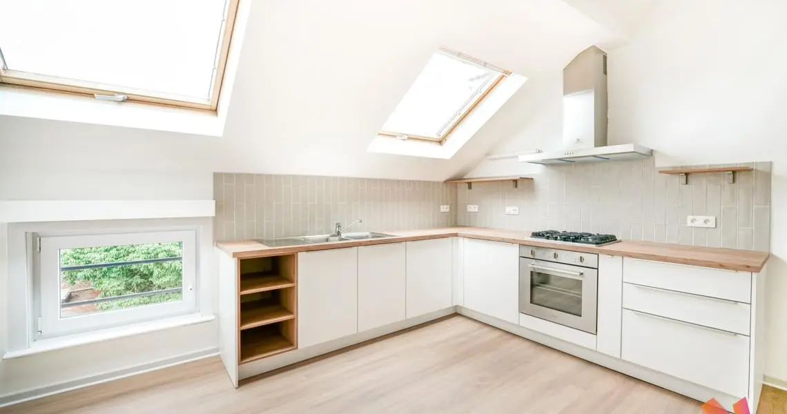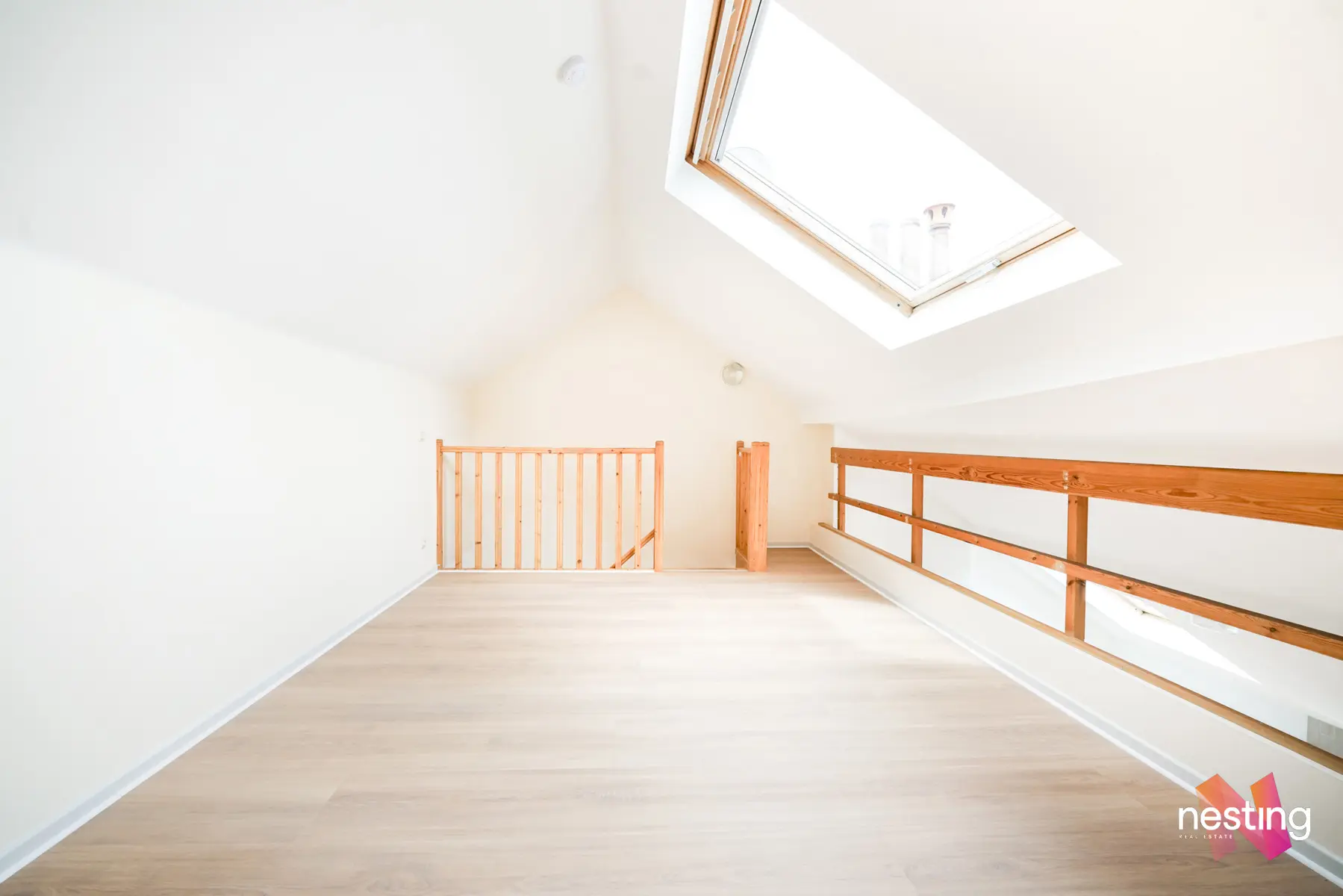 Grand séjour de +/- 29 m2 + cuisine ouverte semi- équipée (sans frigo ni congélateur), une salle de bain, un WC séparé , ainsi qu'une chambre et un bureau.