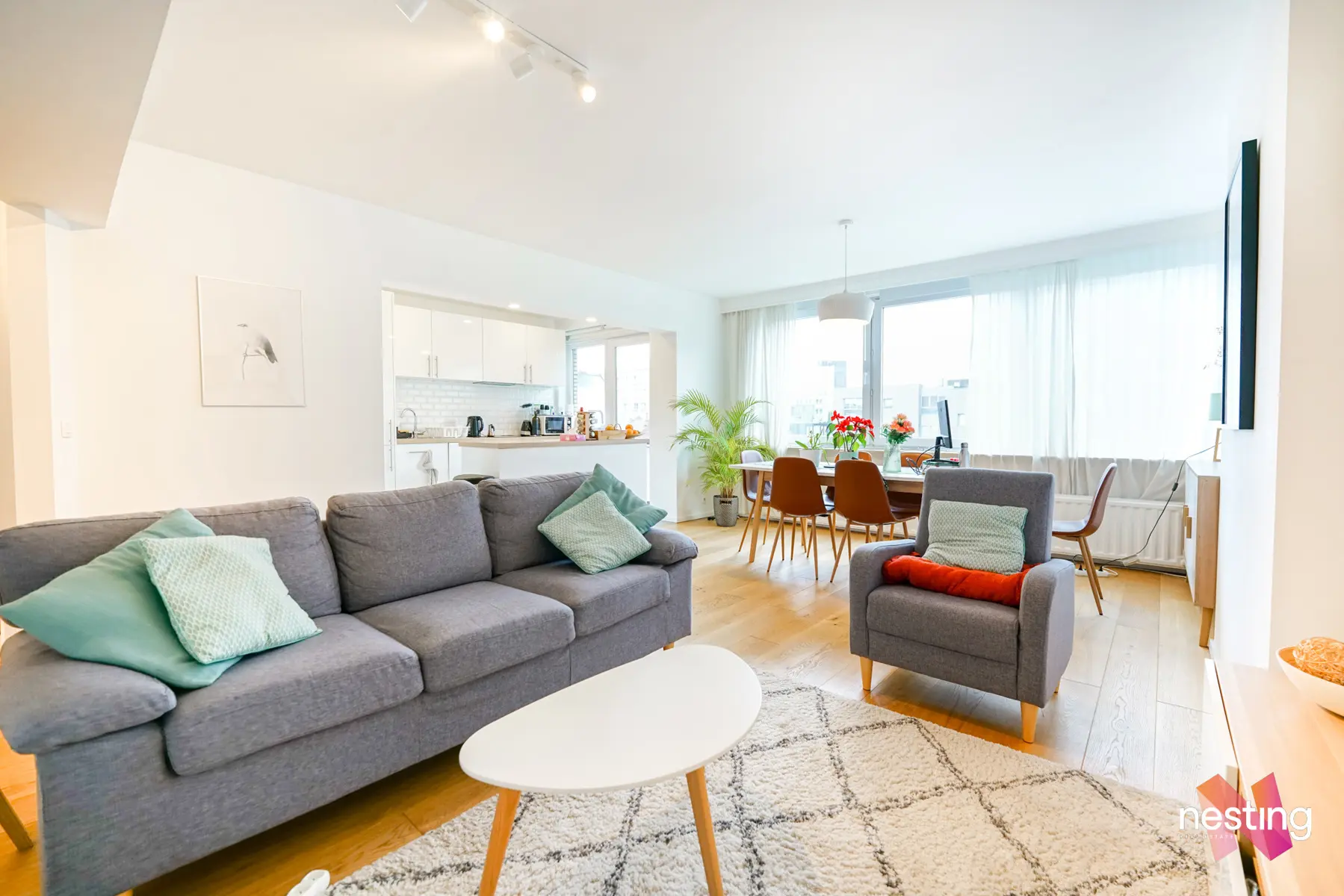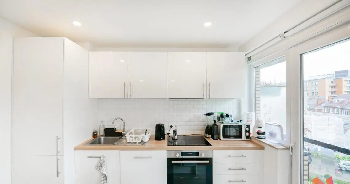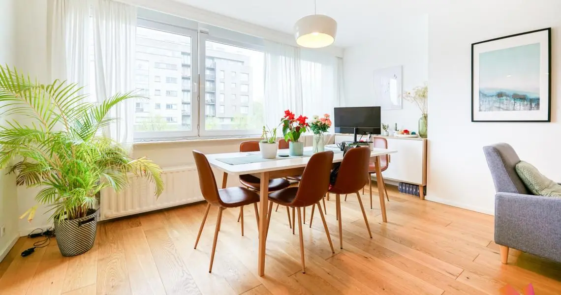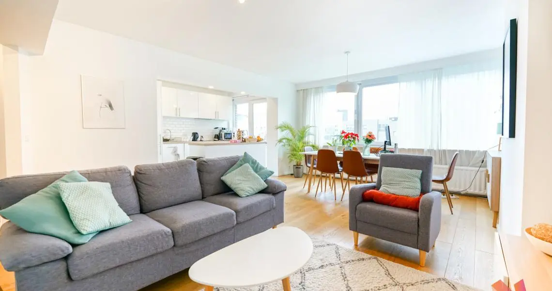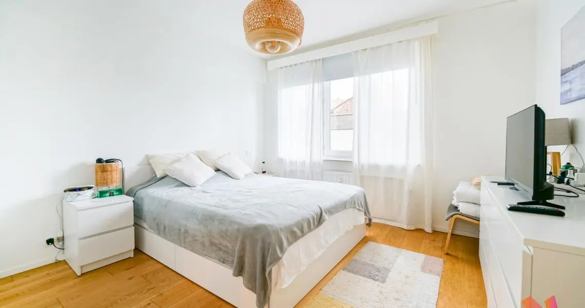 Appartement spacieux de +/- 90m2 au 5e étage très lumineux, complètement meublé (électroménager & TV compris), dans un environnement calme offrant :