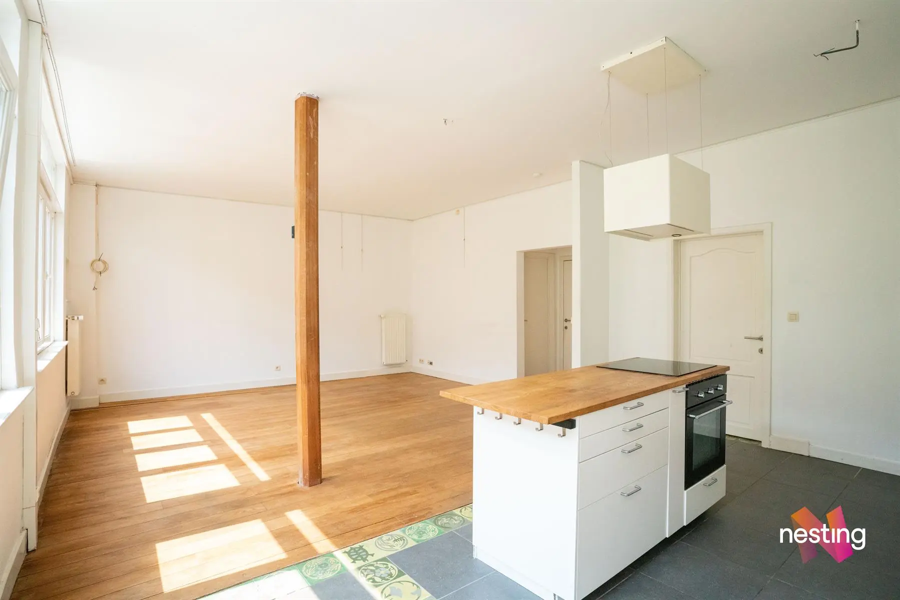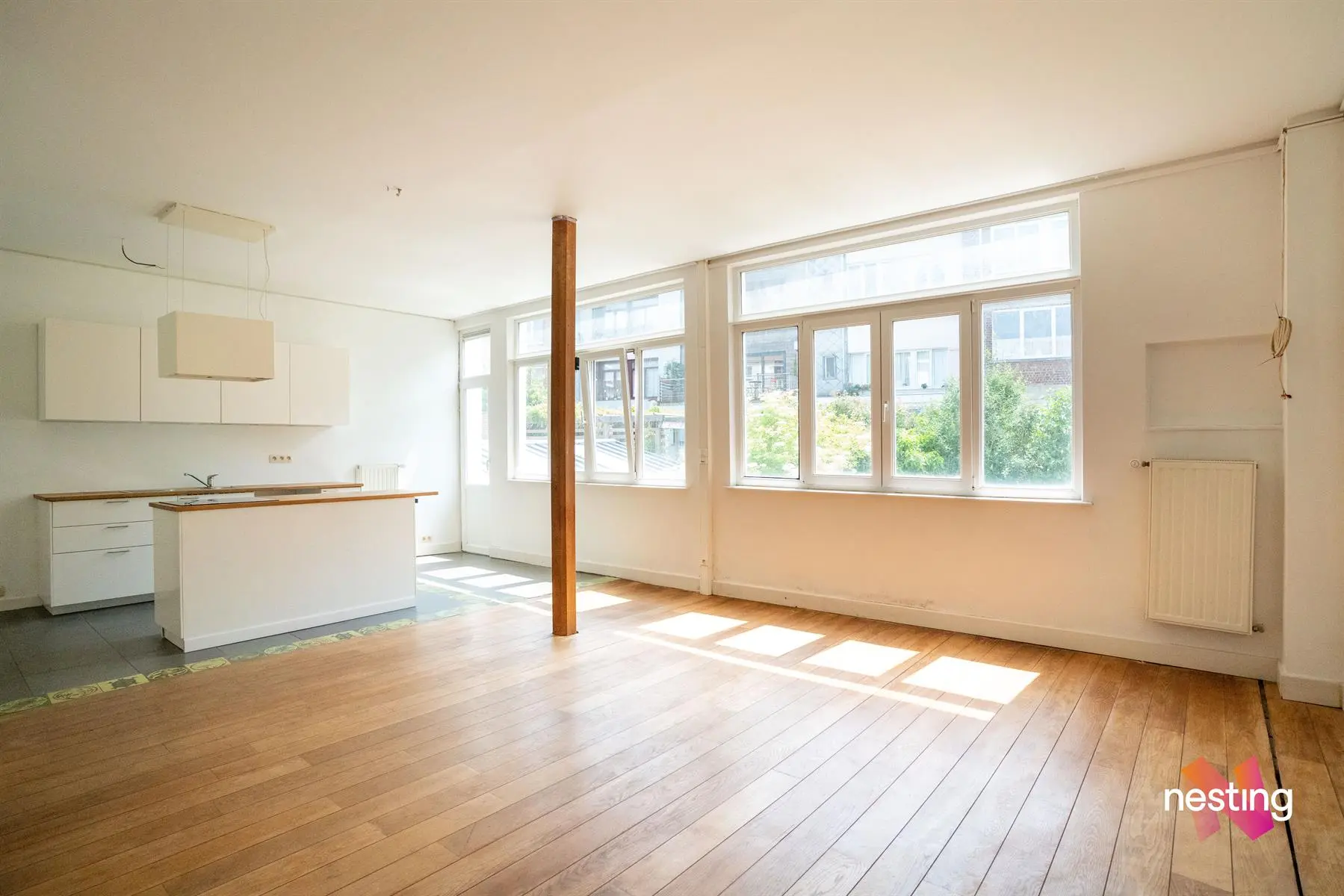 hall d'entrée, wc séparé, grand séjour, cuisine US semi-équipée, chambre avec accès à une terrasse de +/-15m², salle de bains.