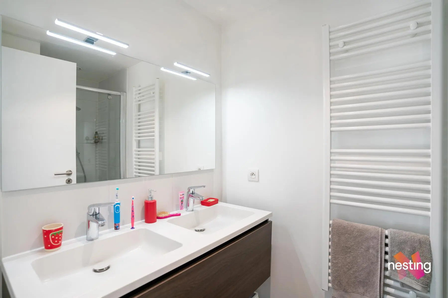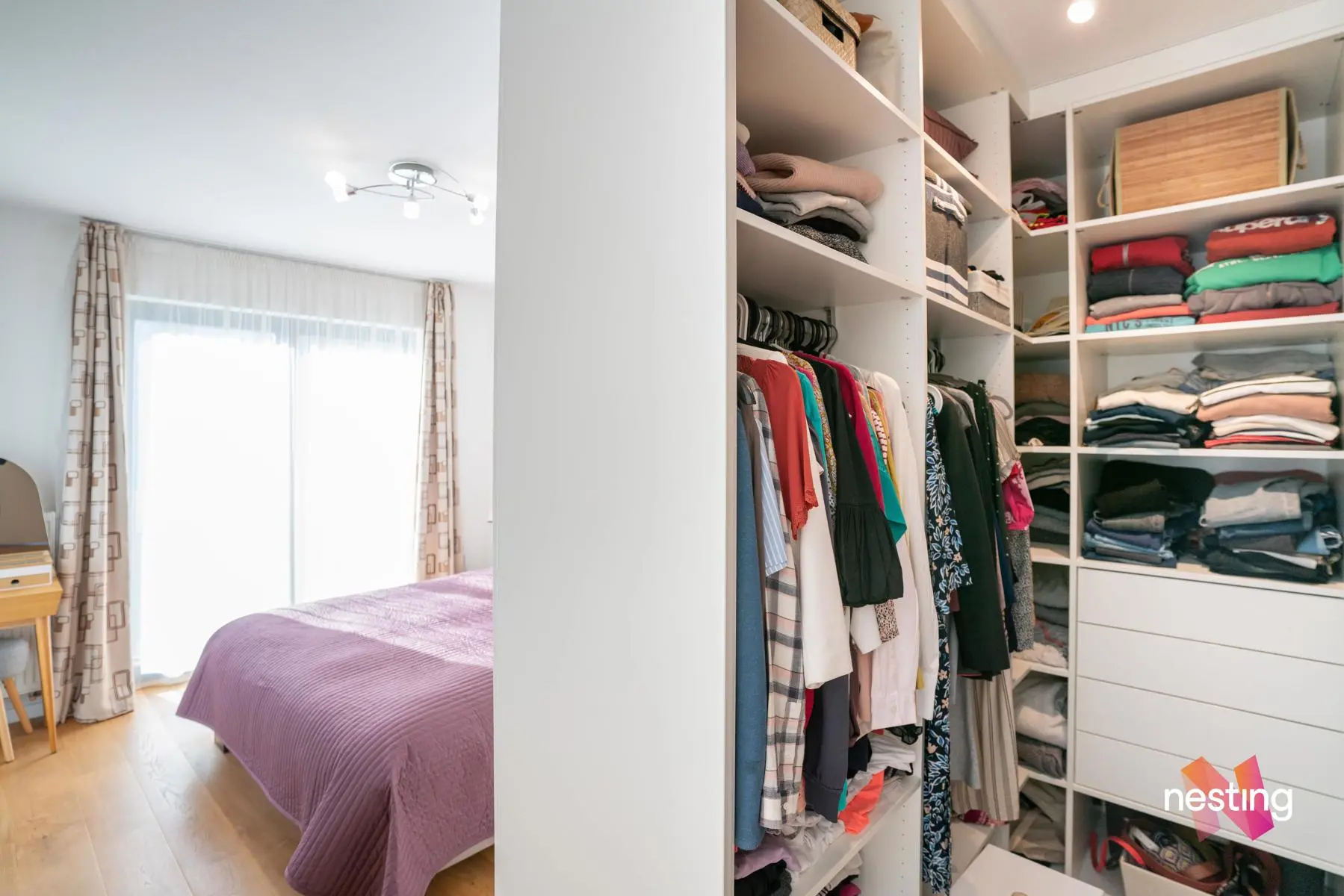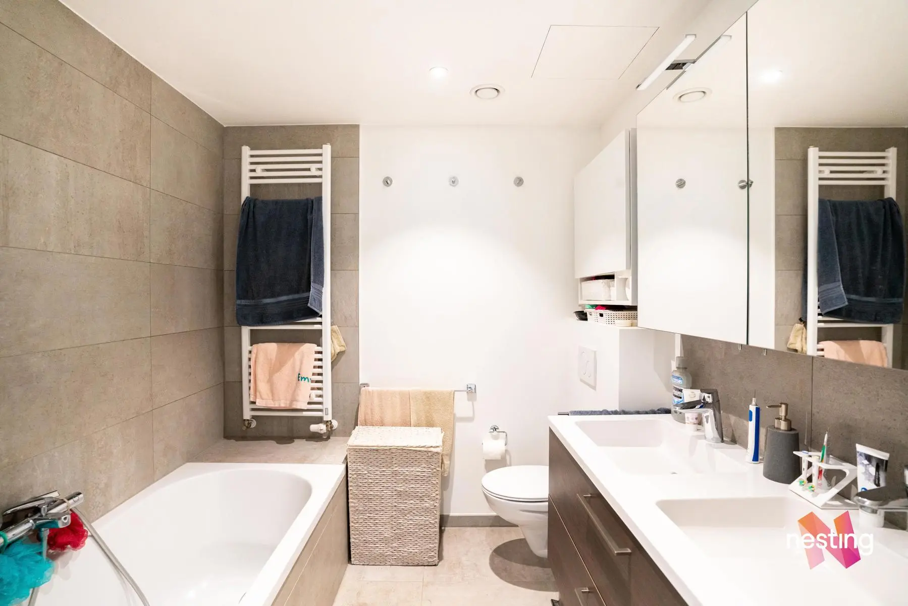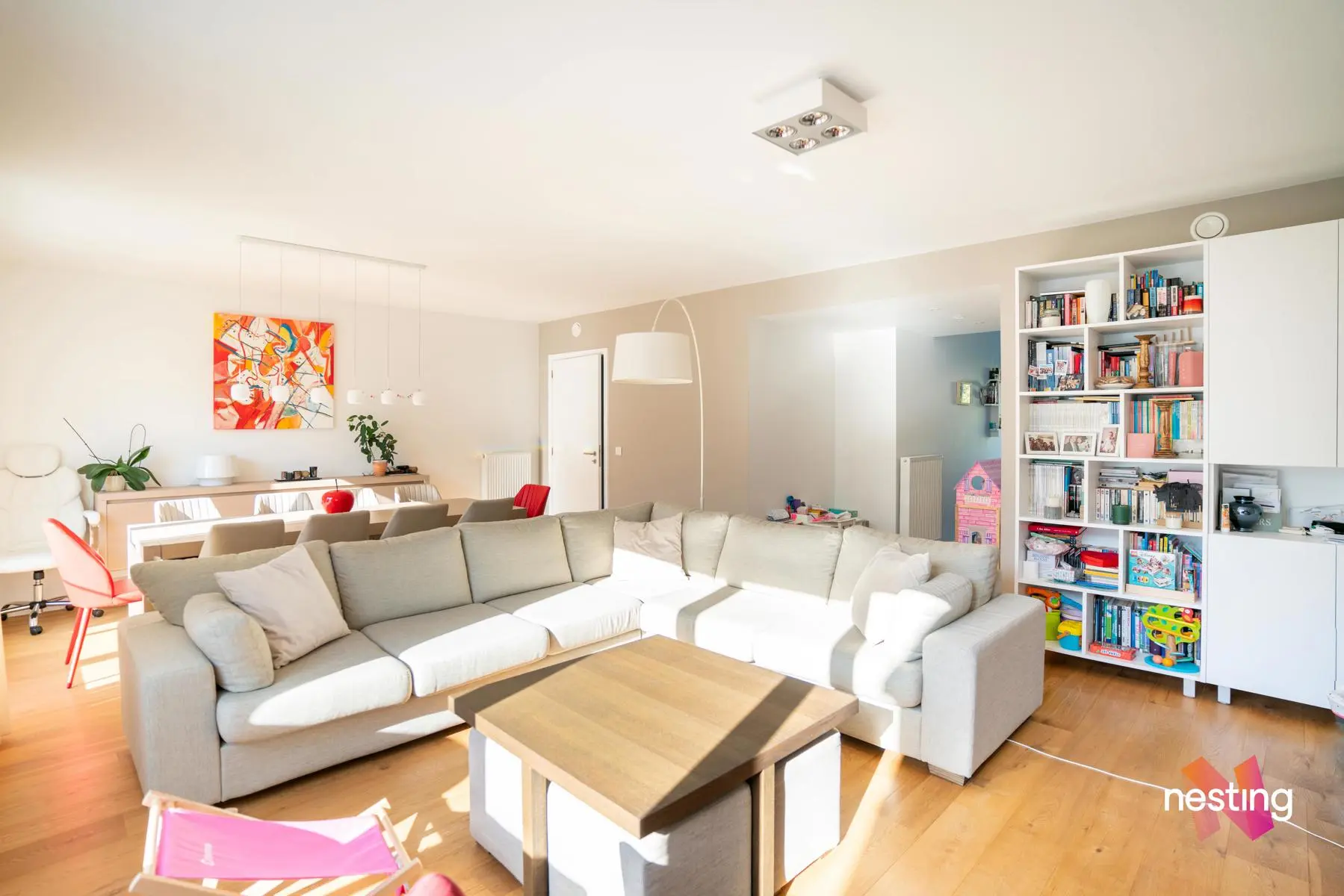 Hall d'entrée avec wc séparé, vaste séjour de +- 40m2 donnant sur une terrasse de +/-20m2 orientée plein sud, une cuisine entièrement équipée, hall de nuit avec placards, grande masterbedroom avec dressing et sa propre salle de bain avec wc, 2 chambres qui partagent une salle de douche, buanderie.