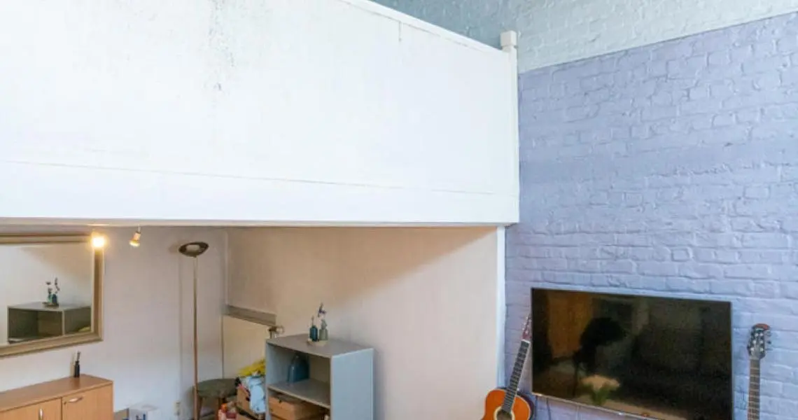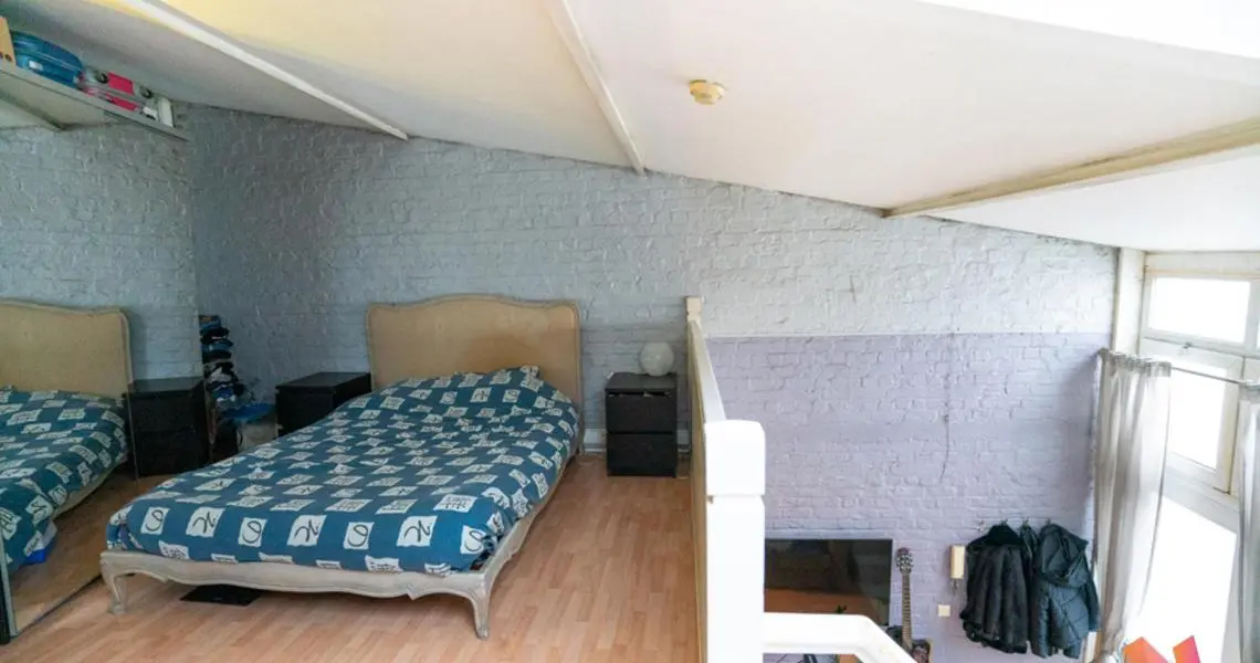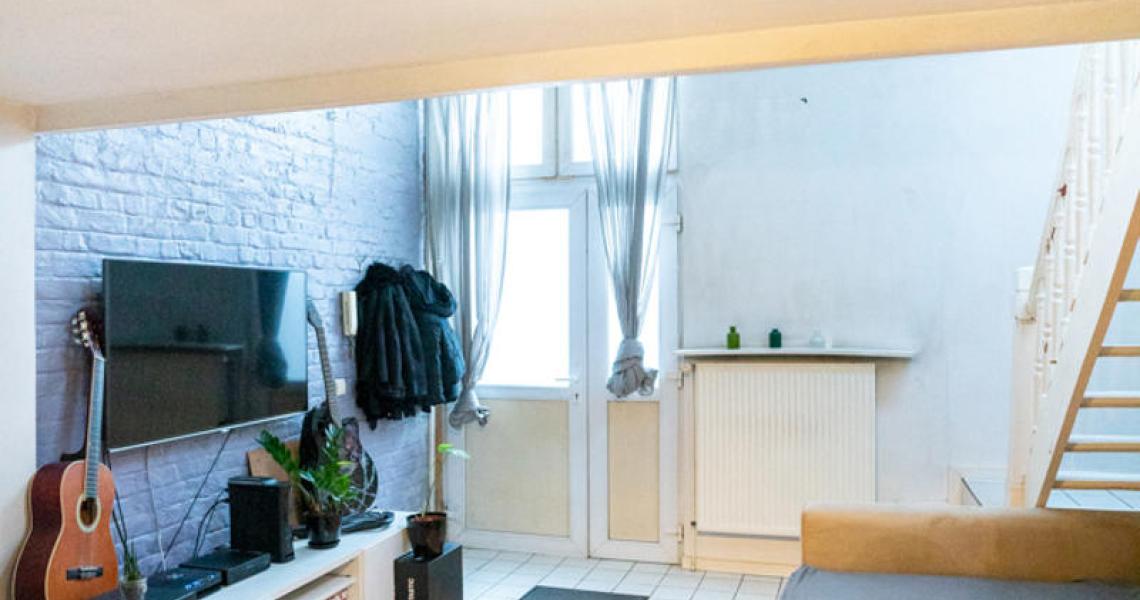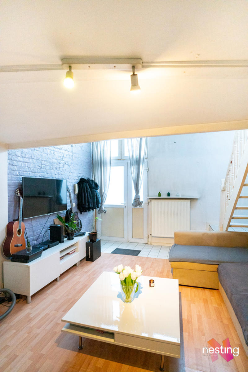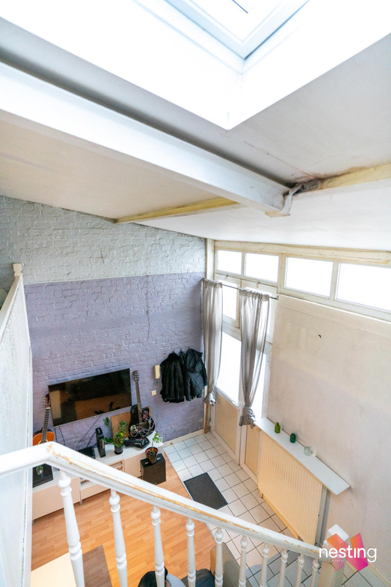 Au rez de chaussée : un séjour de +- 20m2 donnant sur une cuisine semi ouverte semi équipée. A l'entresol :un wc séparé et au 1er étage une chambre en mezzanine de +- 13m2, une salle de bain et un coin bureau.