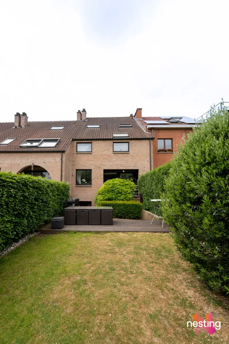 Au 1er étage : un salon avec feu ouvert, salle à manger, une cuisine US super équipée, accès à une la terrasse et au jardin de +- 125m2