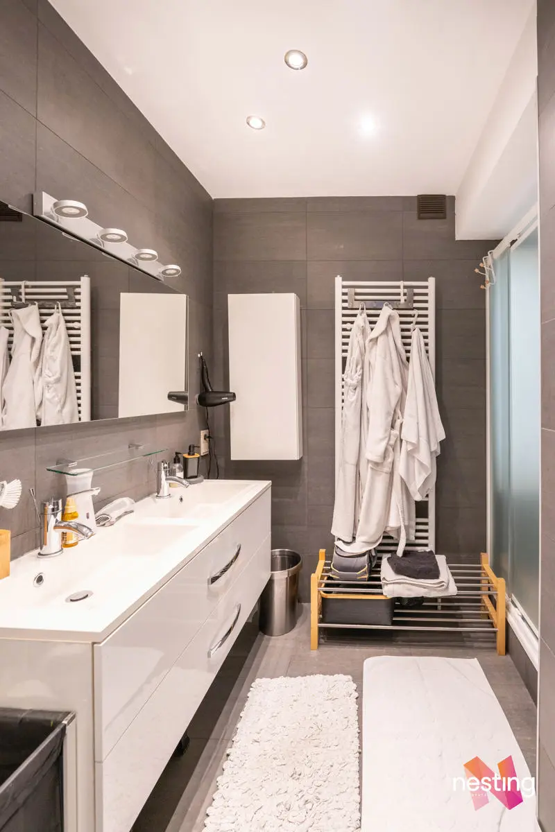 Au deuxième étage : hall, wc séparé, une salle de douche, 1 chambre avec placards de 25,5m2 (initialement divisée en 2 chambres) + masterbedroom de +) 23m2 avec ses placards et sa salle de bains (8,5m2)