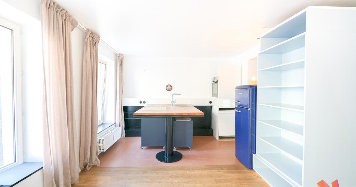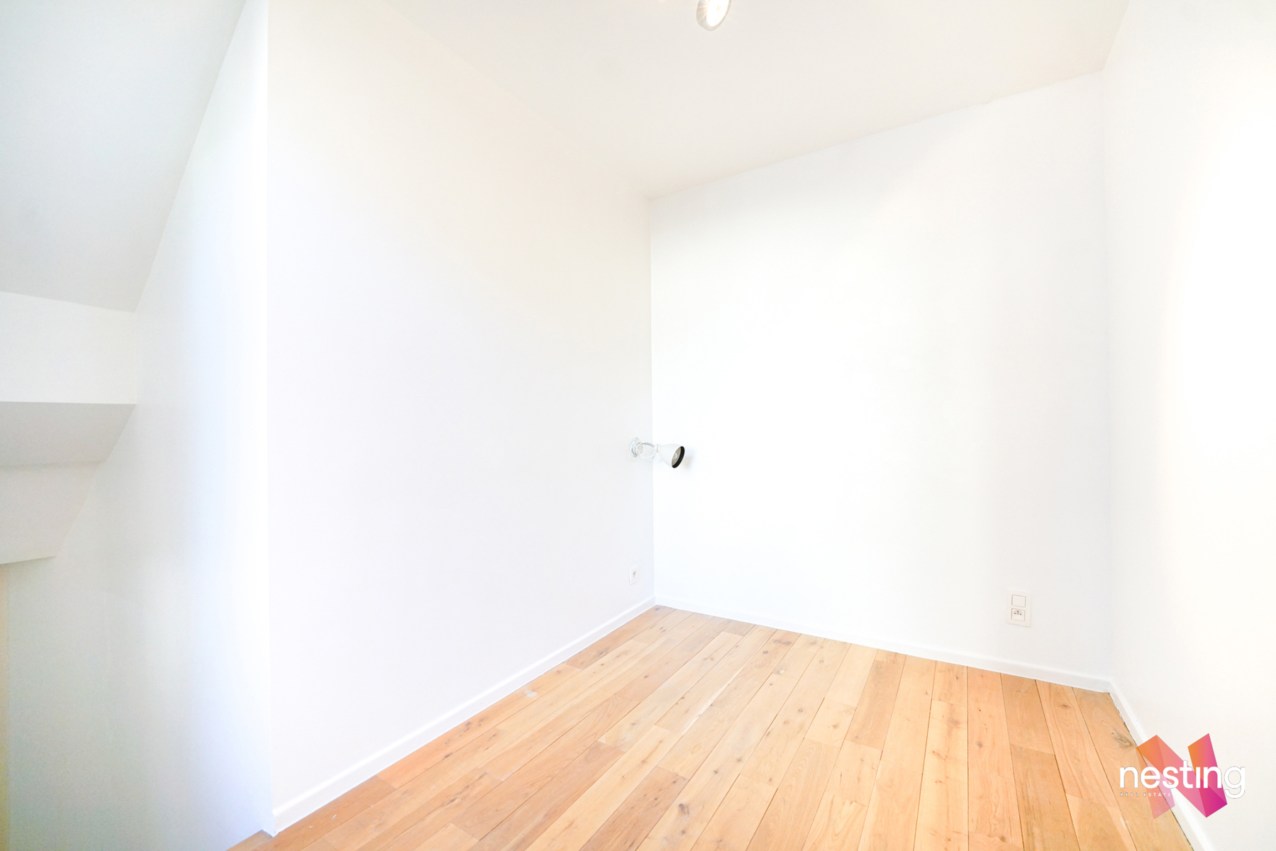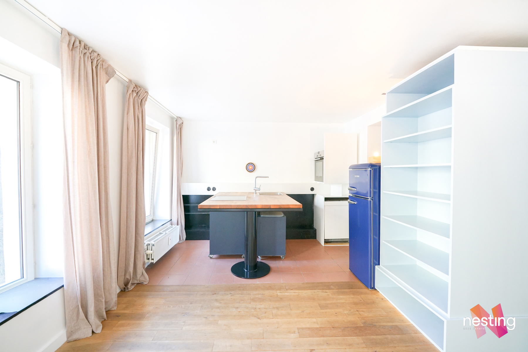 Ce duplex vous offre un séjour de +/- 30 m², une cuisine américaine super équipée (+ machine à laver), une grande chambre de +/- 21 m², un bureau, une salle de bain et des WC séparés.