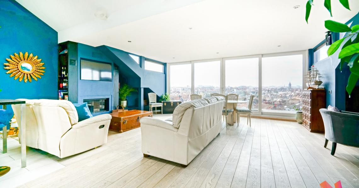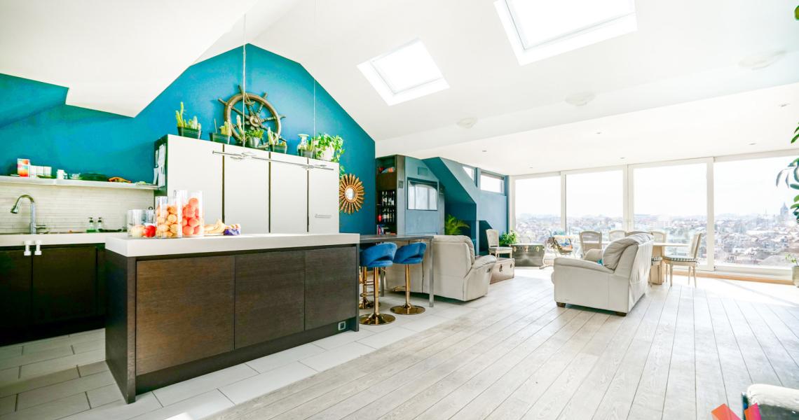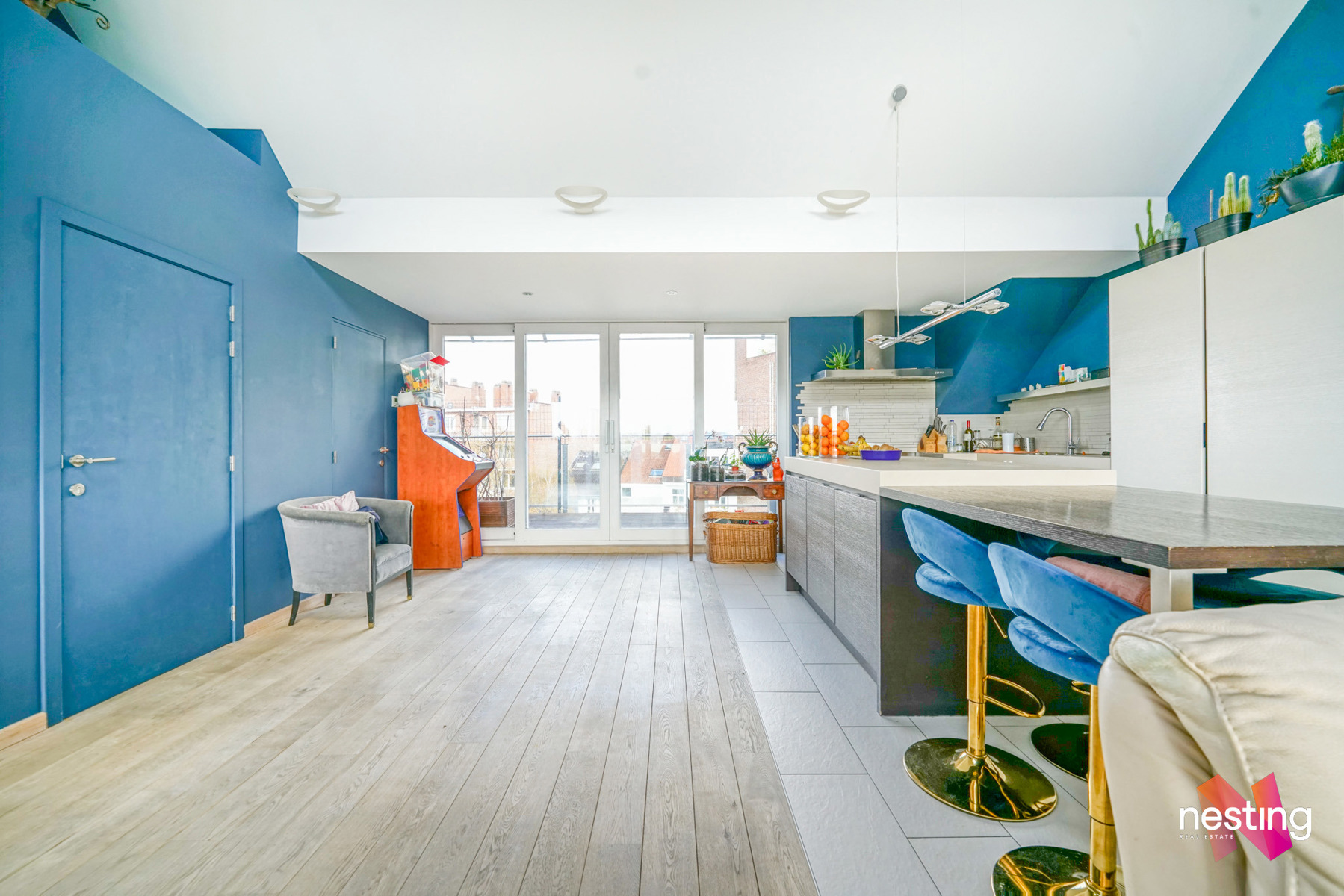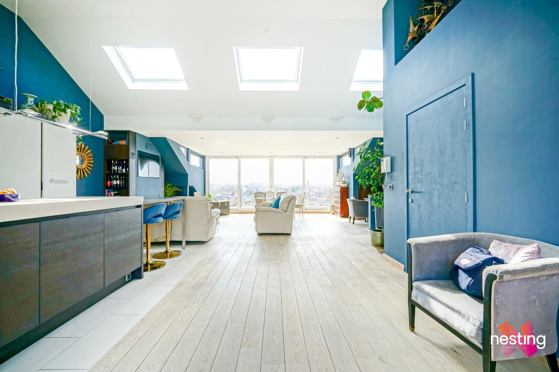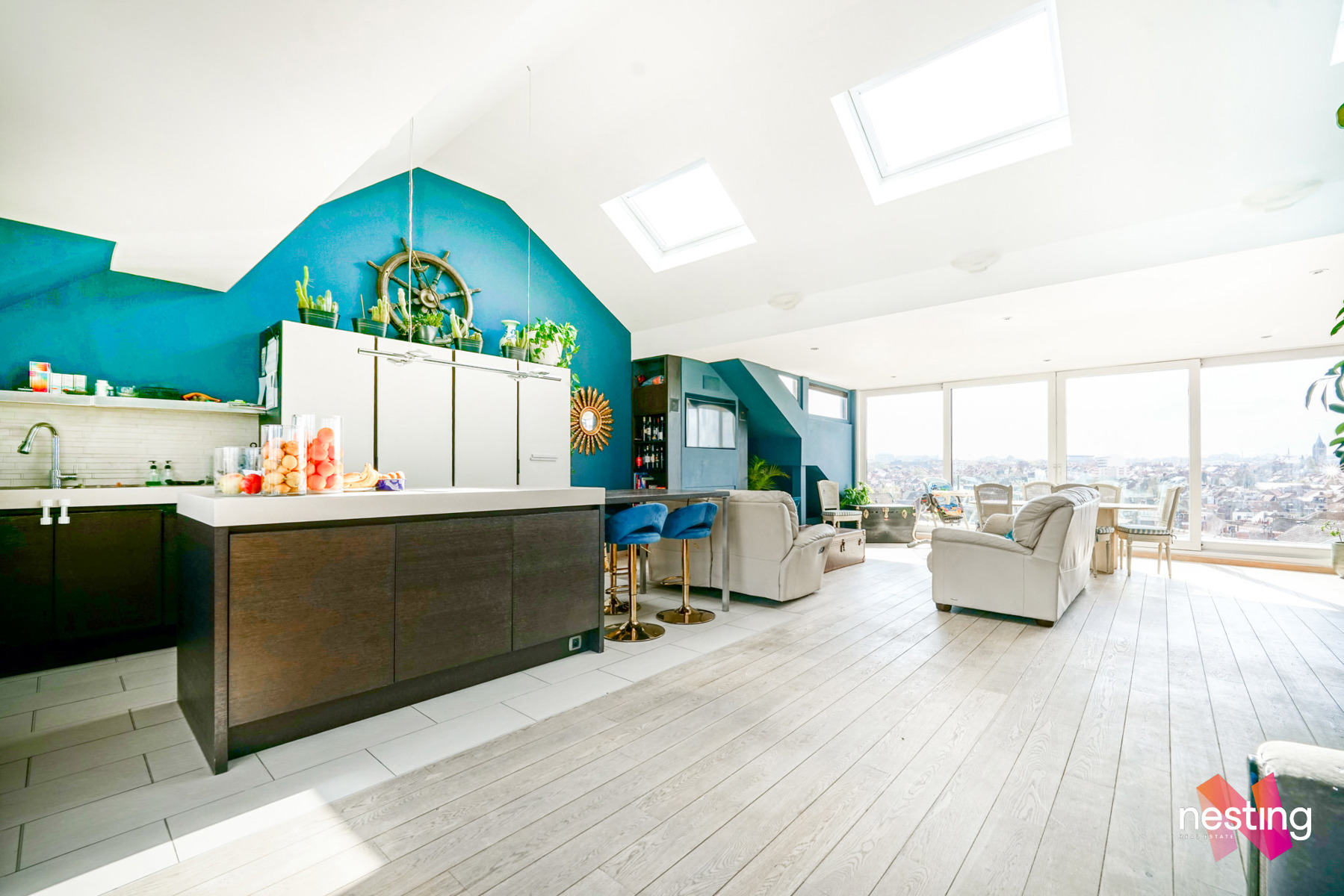 Au 5ème étage : un vaste séjour de +-80m2 avec une cuisine ouverte super équipée donnant sur une terrasse de +-16m2.