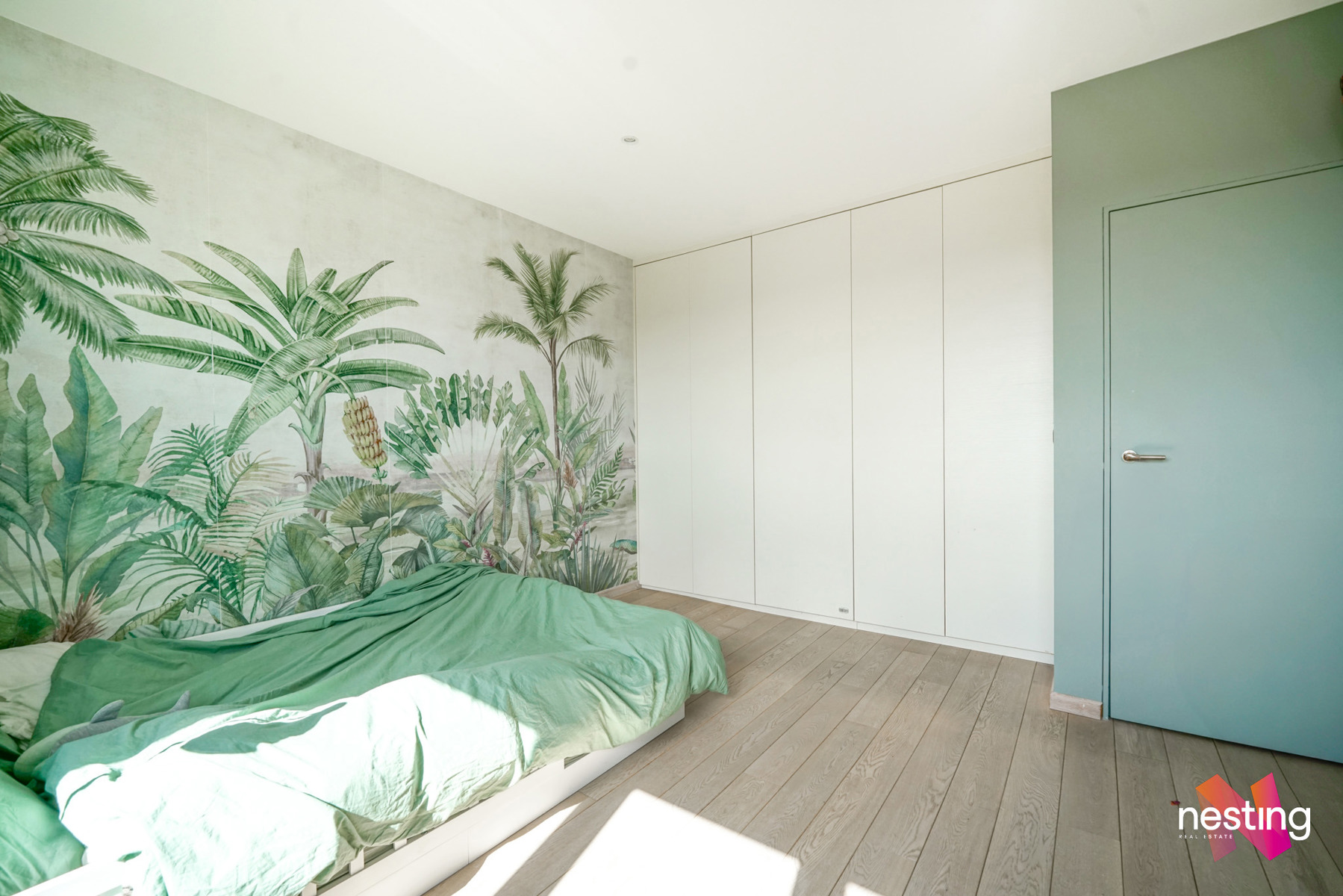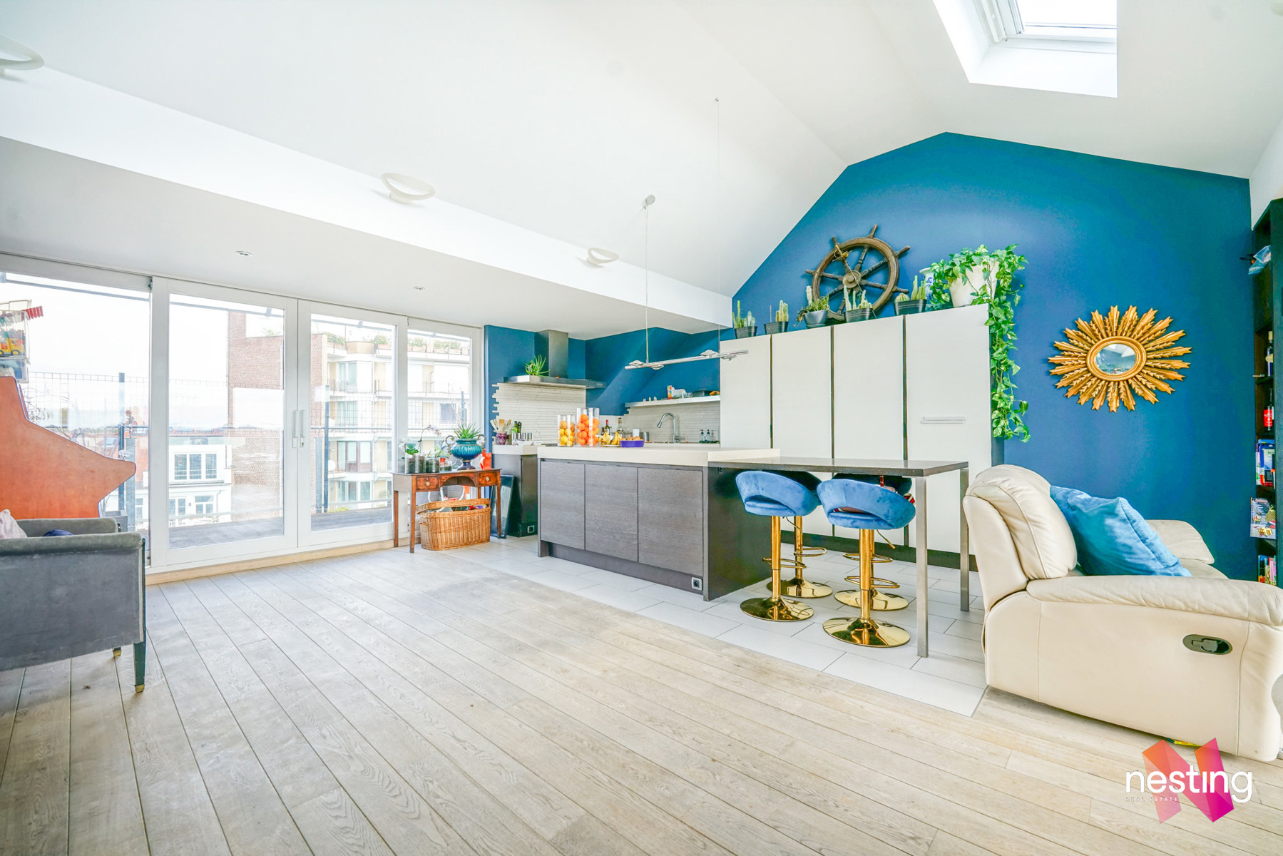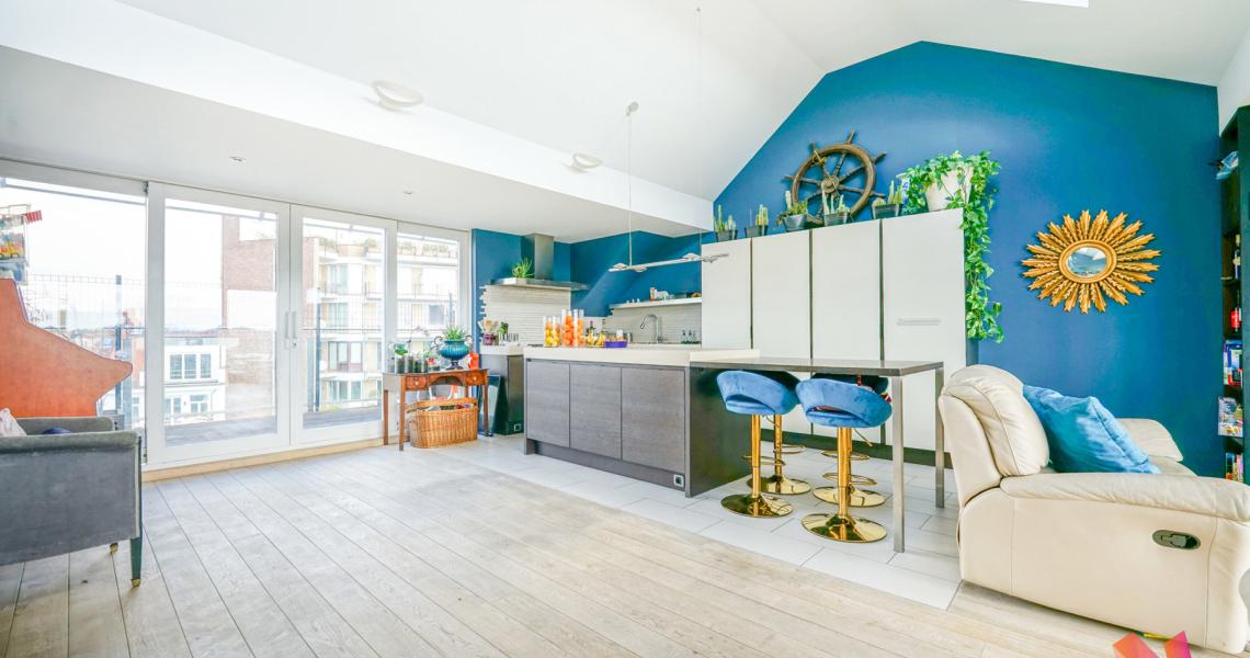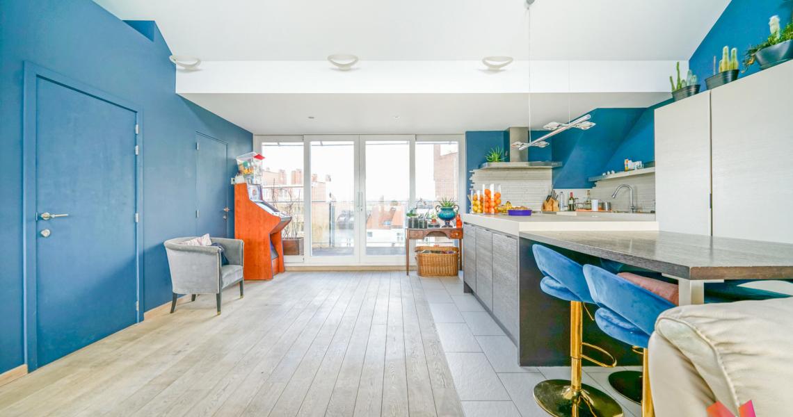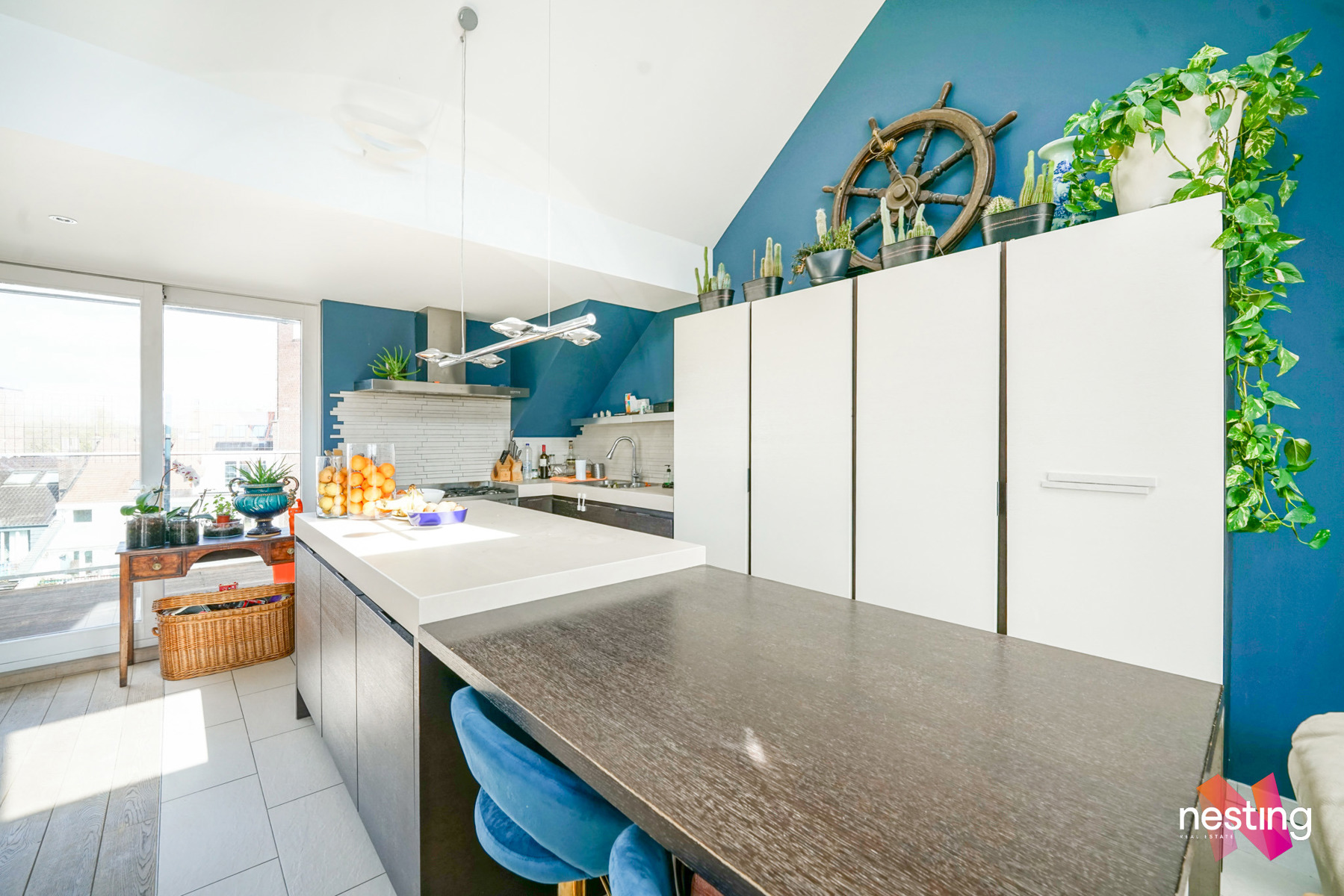 Au 5ème étage : un vaste séjour de +-80m2 avec une cuisine ouverte super équipée donnant sur une terrasse de +-16m2.