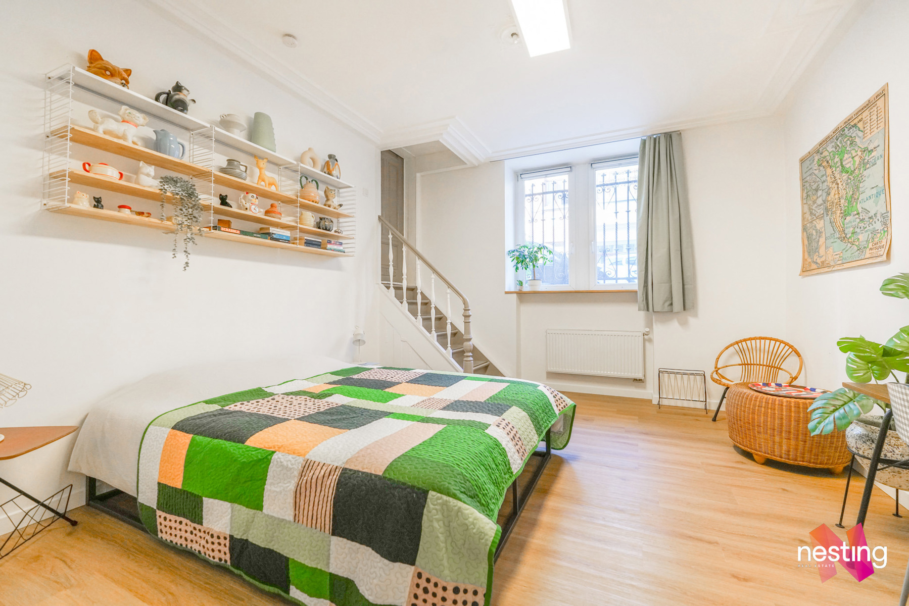 Au sous-sol : Un dressing donnant accès à une cour de +-16m2, deux chambre de +-9,5m2 et +-21m2 et une salle de bains.
