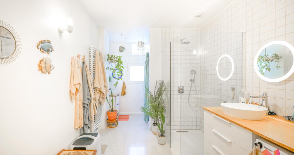 Au rez bel étage : Un bel espace salon, une cuisine ouverte équipée, une salle à manger et une salle de douche.