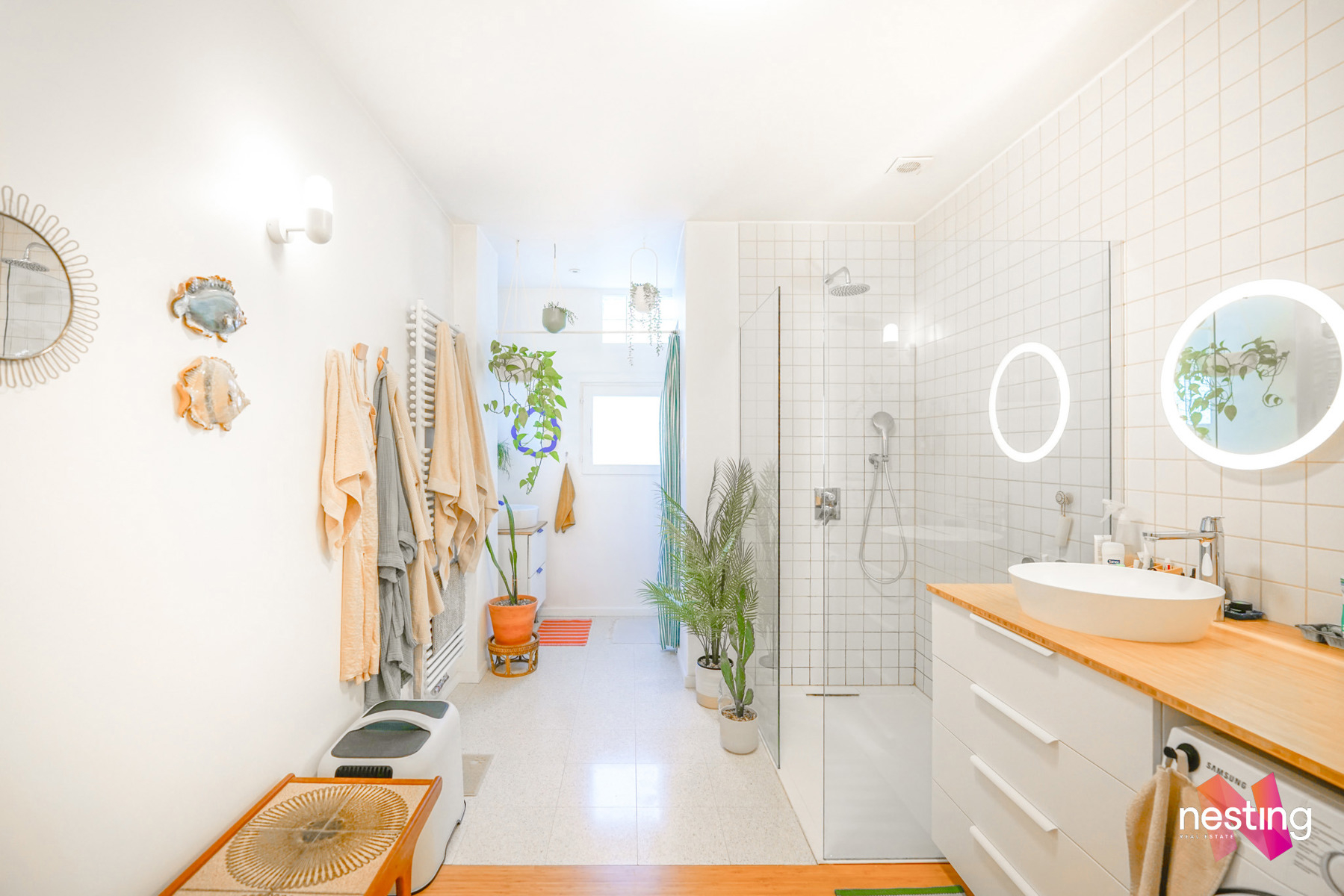 Au rez bel étage : Un bel espace salon, une cuisine ouverte équipée, une salle à manger et une salle de douche.
