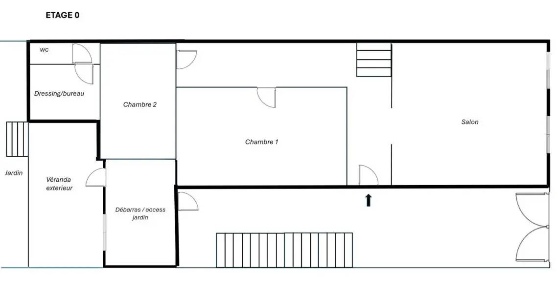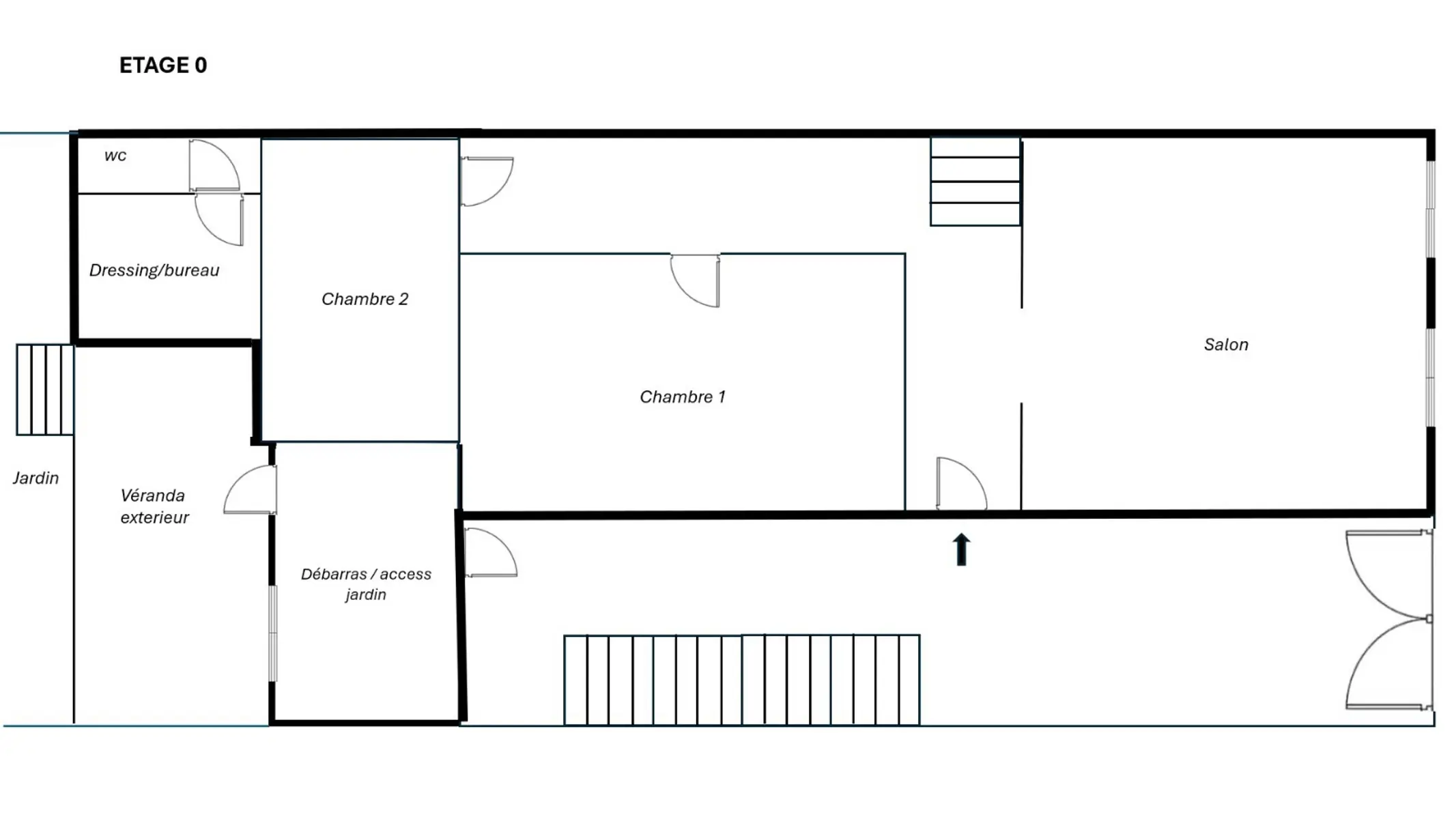 Au rez-de-chaussée : Un vaste séjour de +- 30m2 , deux chambres de +-14m2 et +-13m2, un bureau et un grand jardin.