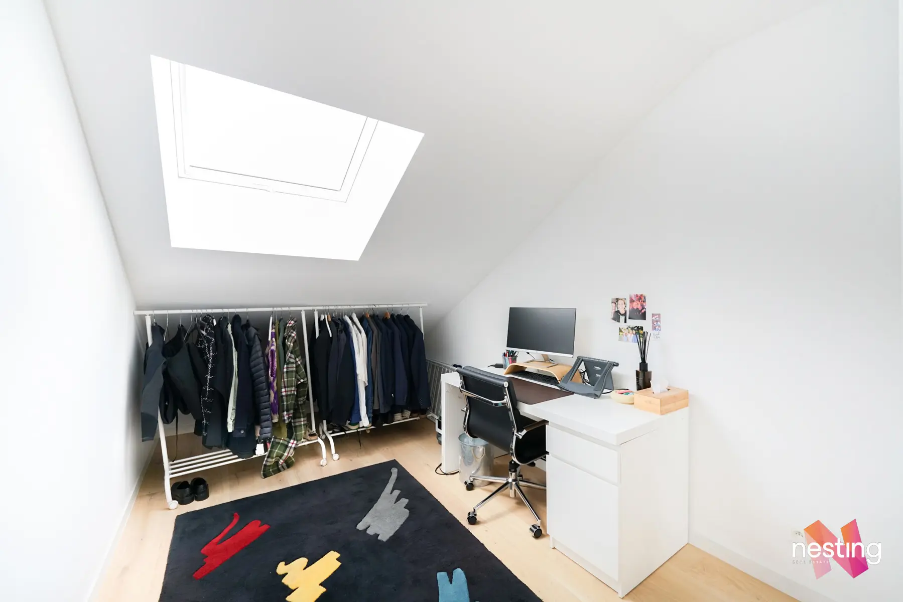 À l’étage : hall de nuit, 2 chambres( 12m2), une salle de bain et Master bedroom de +- 20m2 avec avec salle de douche privative.