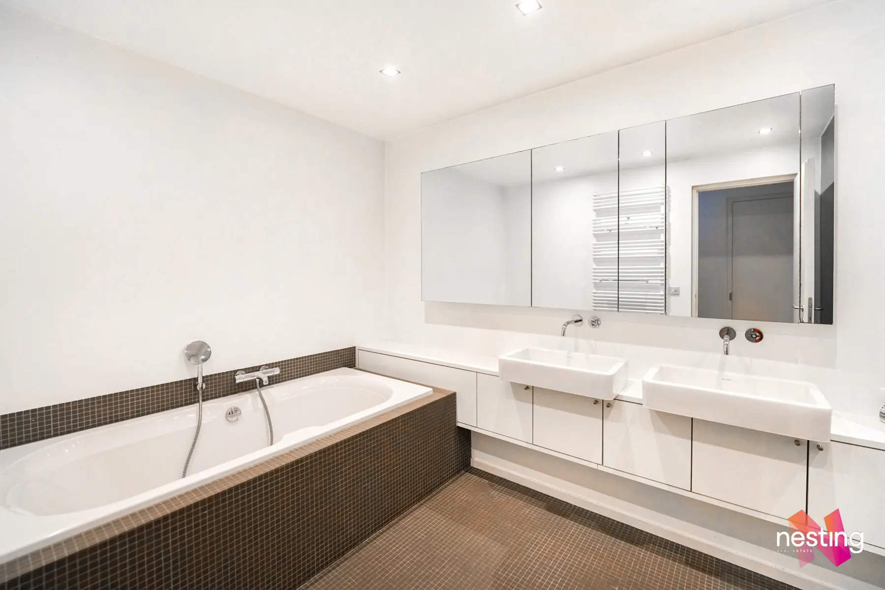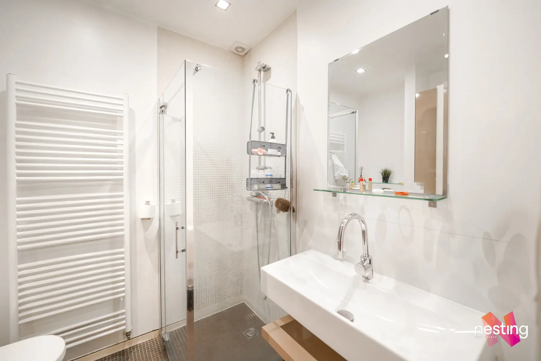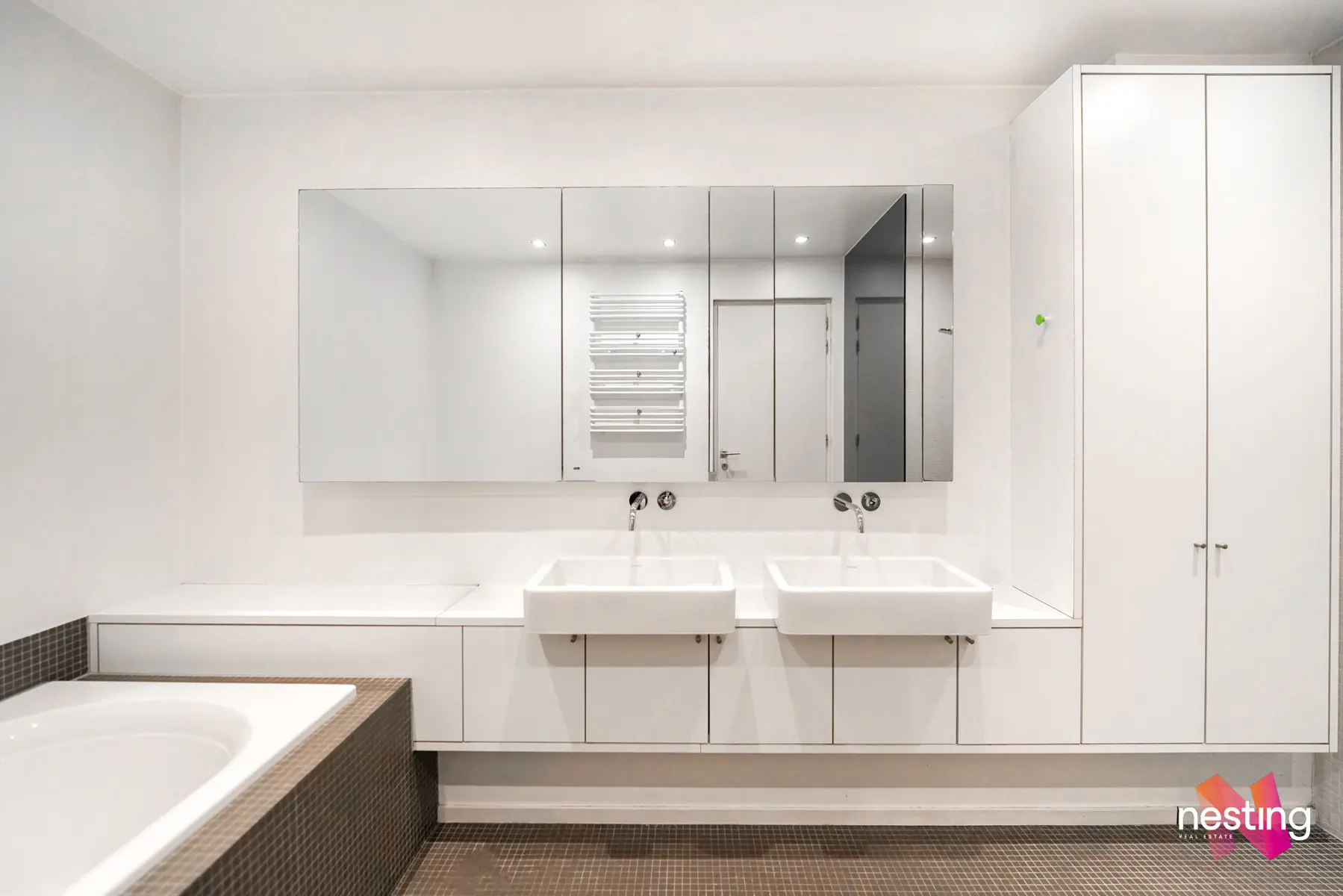 L’appartement se compose d’un hall d’entrée avec toilette séparée et vestiaire, d'un vaste séjour avec une cuisine ouverte entièrement équipée, d'une grande salle de bain avec douche à l'italienne et baignoire, d'une deuxième salle de bains et de deux chambres spacieuses de +-18m2 et +-25m2.