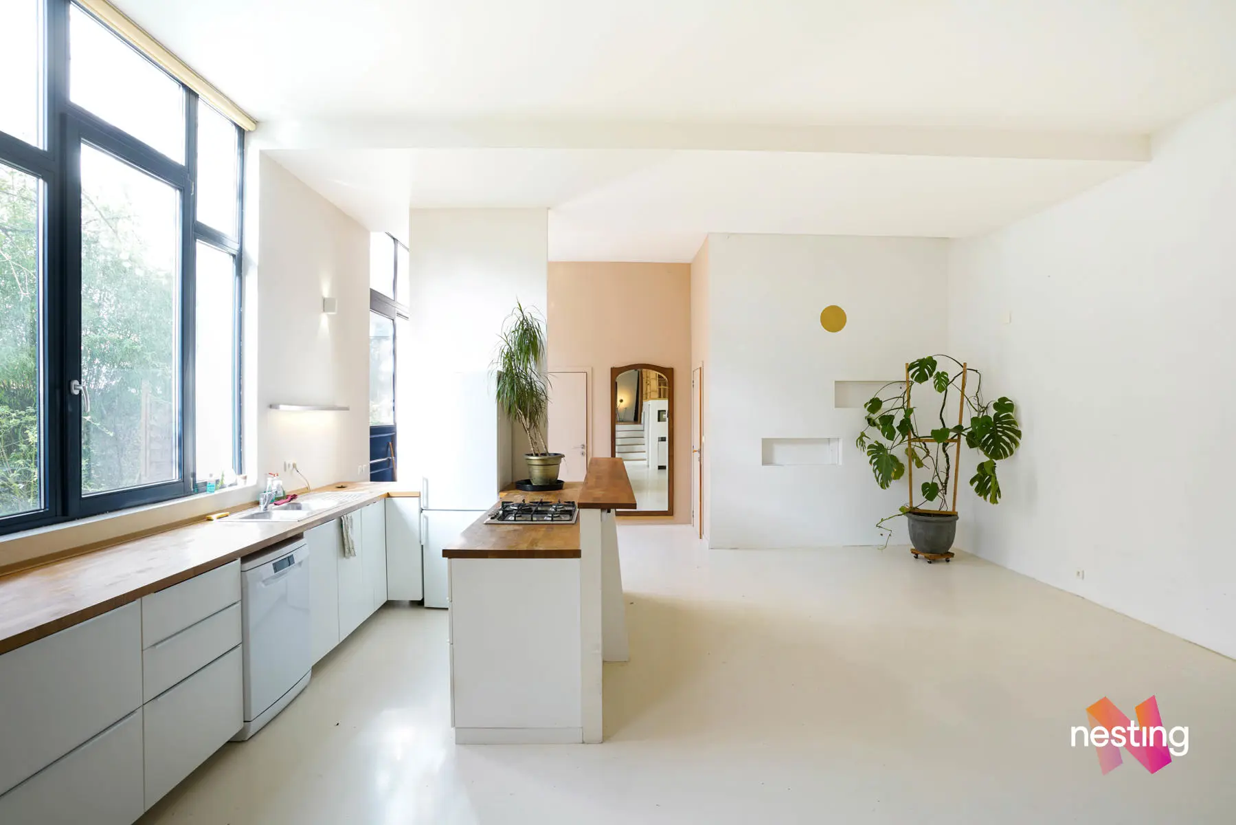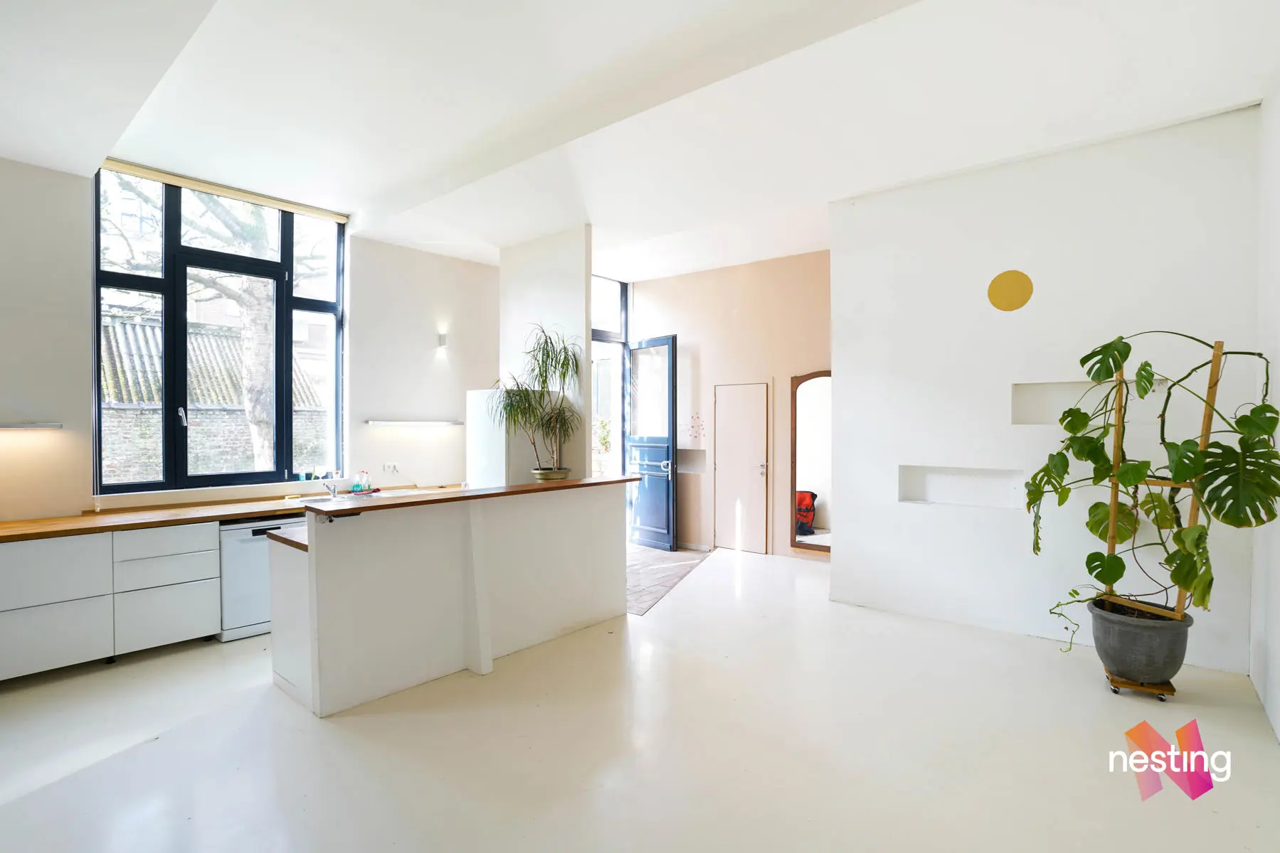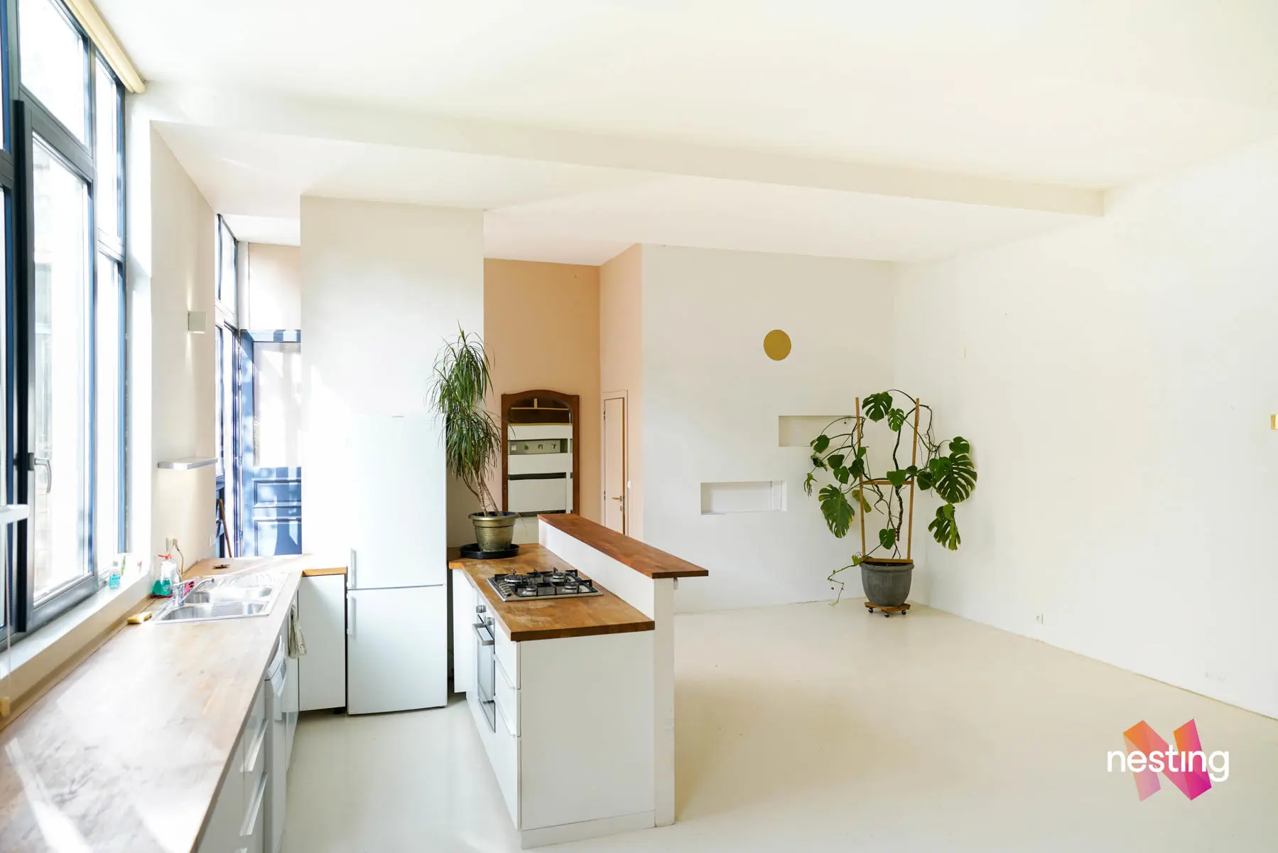 Situé à proximité de la gare du Nord, de Tour et Taxis, des commerces et des transports en communs, dans un intérieur d'îlot, superbe loft de +/-110m2, calme, lumineux, parquet partout et offrant 17m de façade !