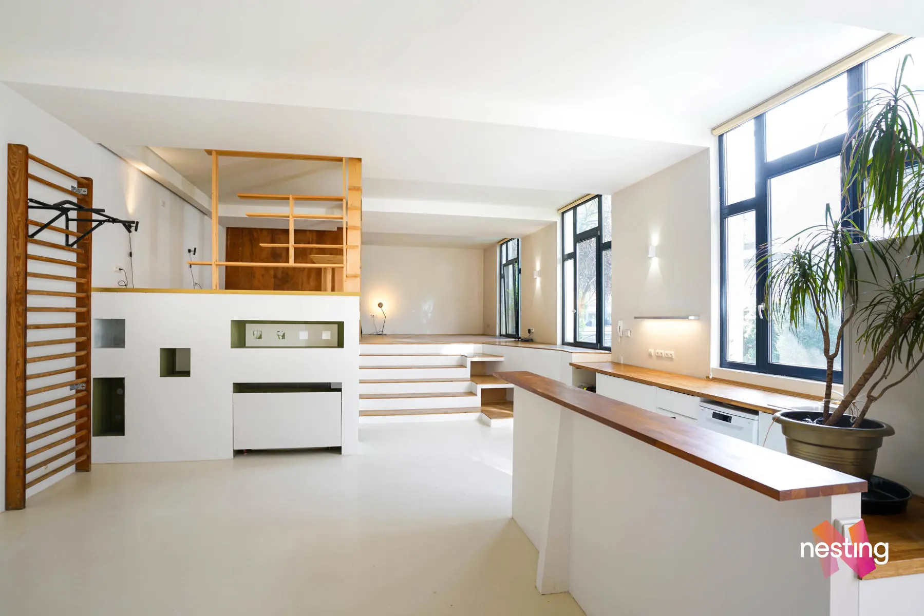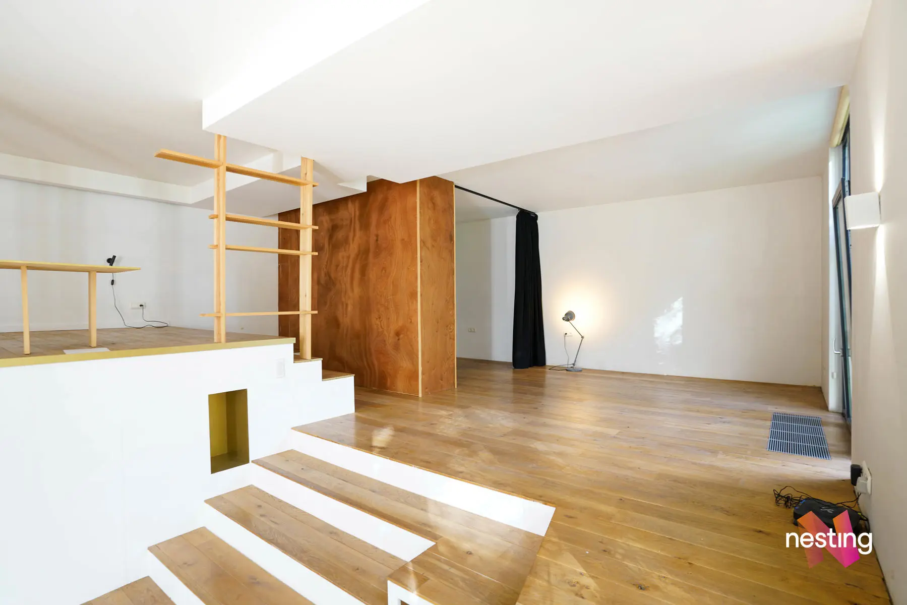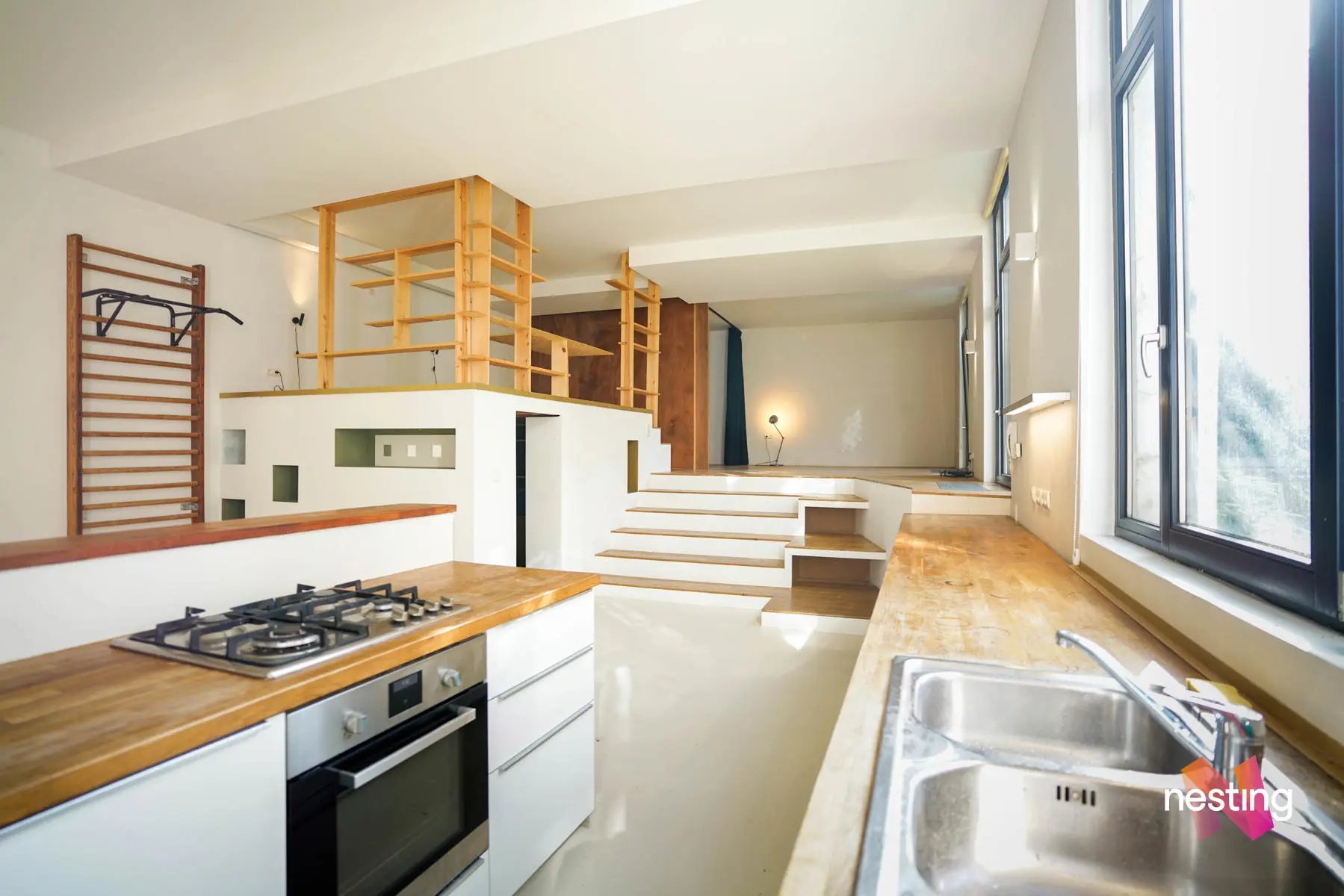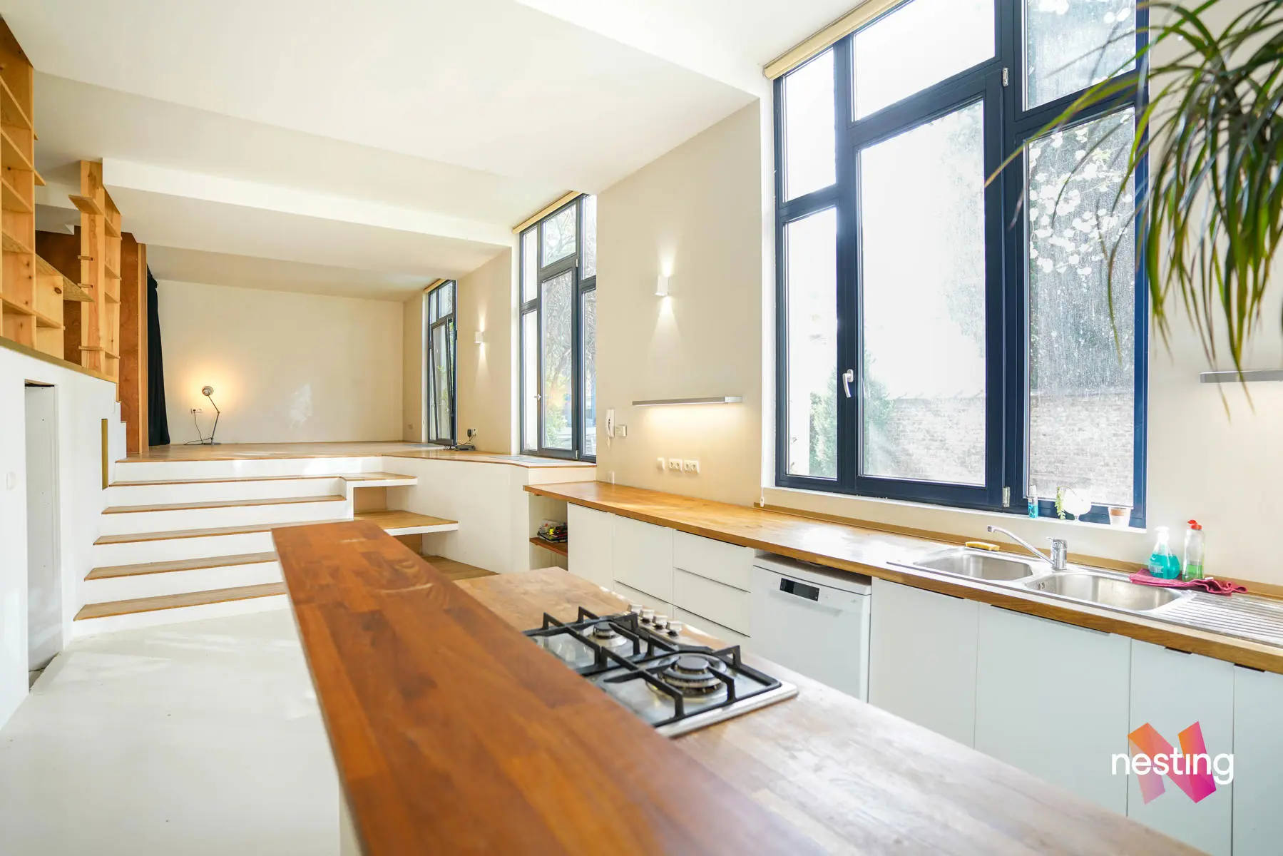 Situé à proximité de la gare du Nord, de Tour et Taxis, des commerces et des transports en communs, dans un intérieur d'îlot, superbe loft de +/-110m2, calme, lumineux, parquet partout et offrant 17m de façade !