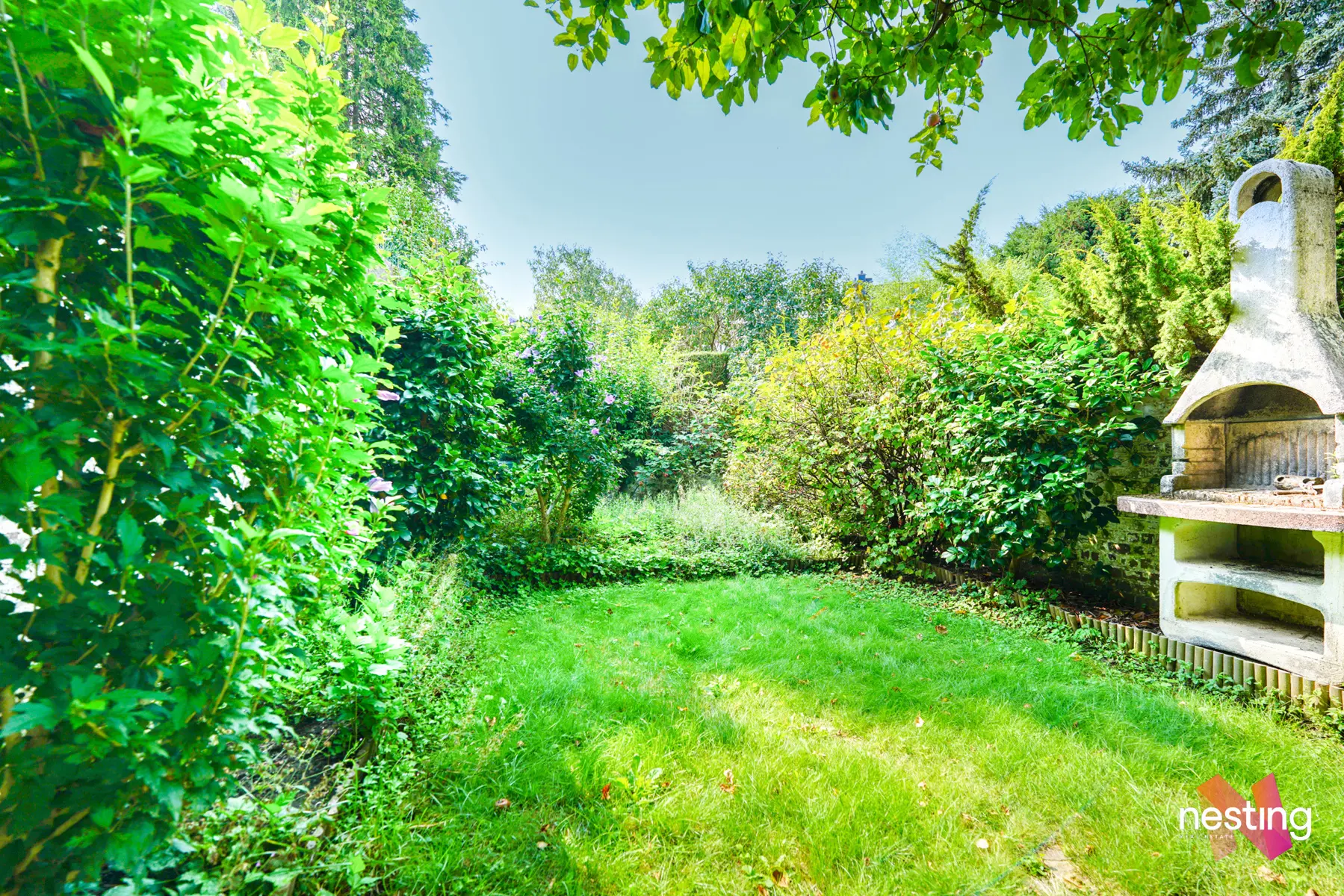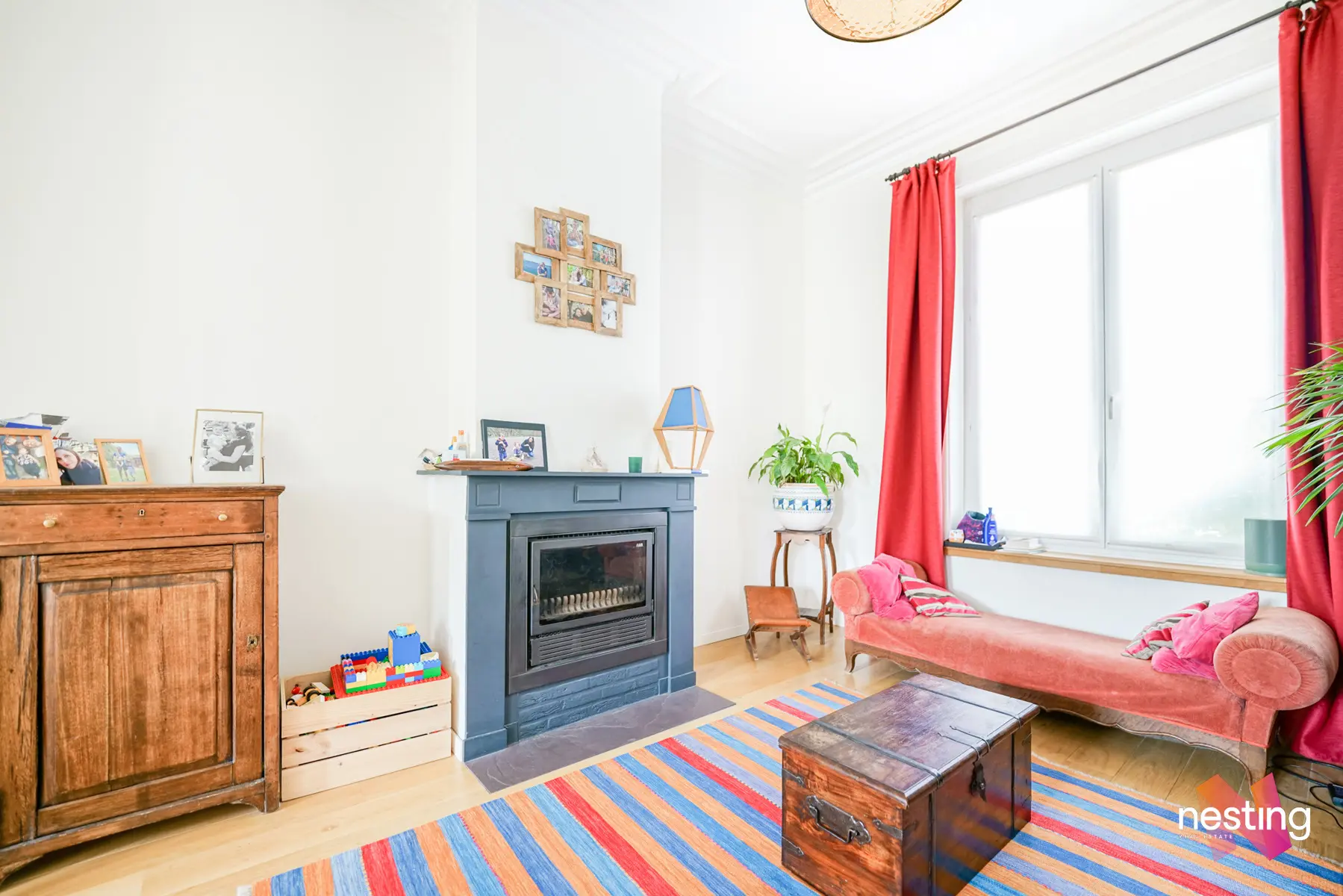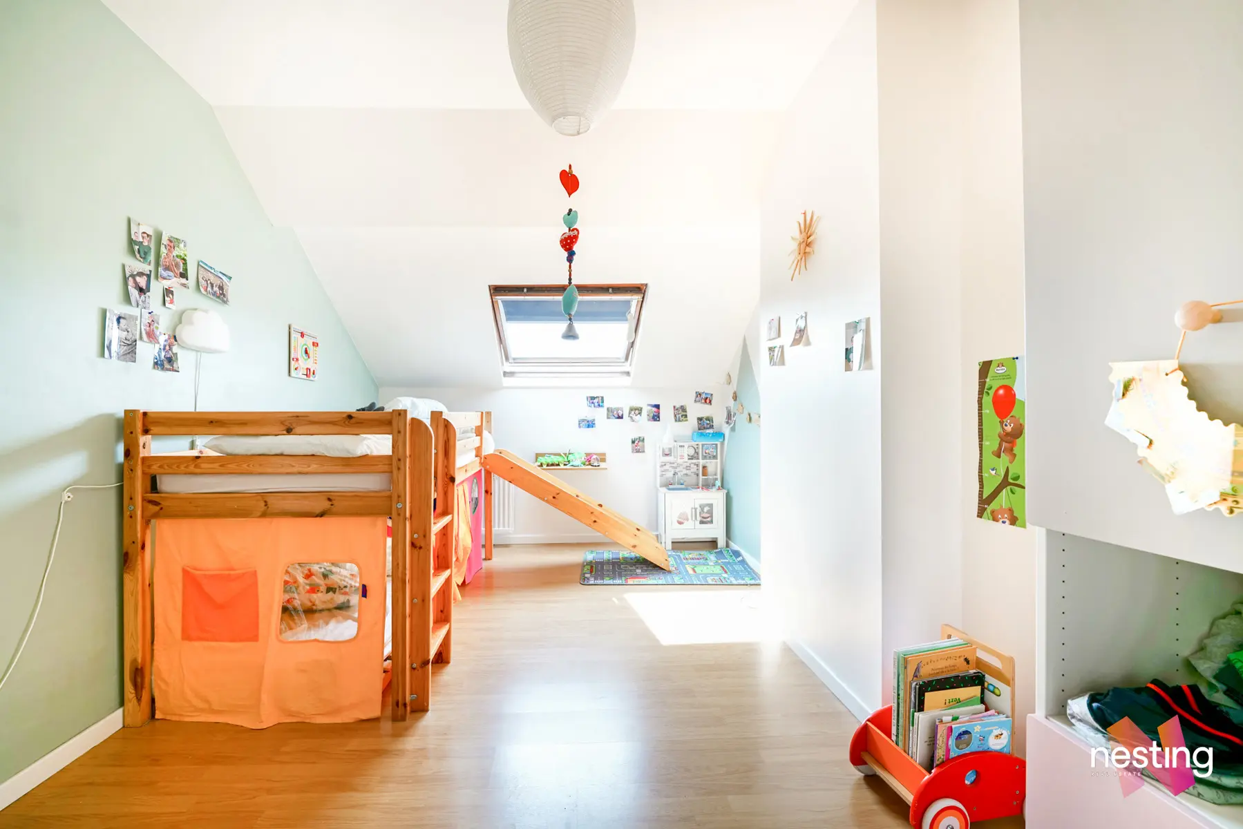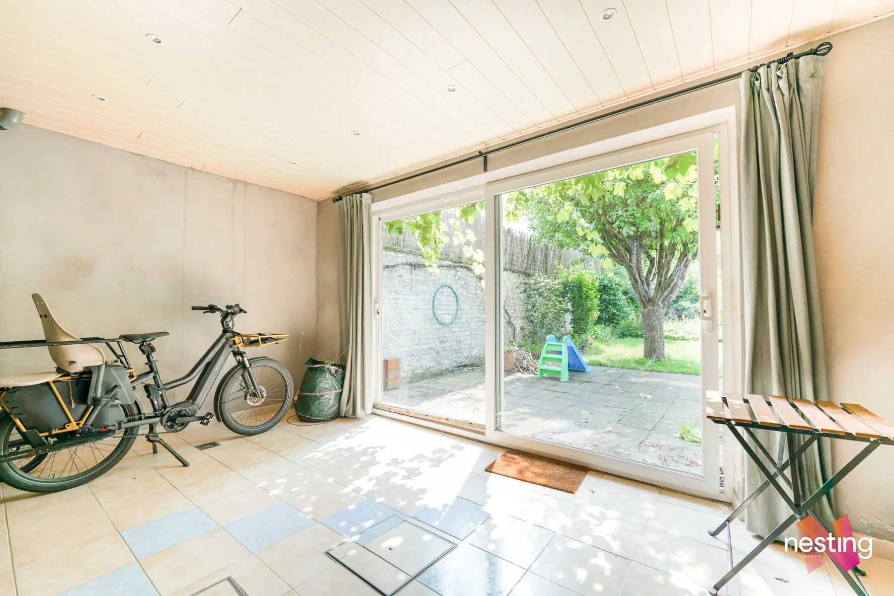 Au rez-de-chaussée : une lumineuse pièce à vivre avec un feu au bois, une grande cuisine américaine super équipée et une salle à manger donnant sur une grande terrasse et le jardin. Au 1er étage : 2 chambres (+- 15,5 et 13) et une belle salle de douche avec wc.