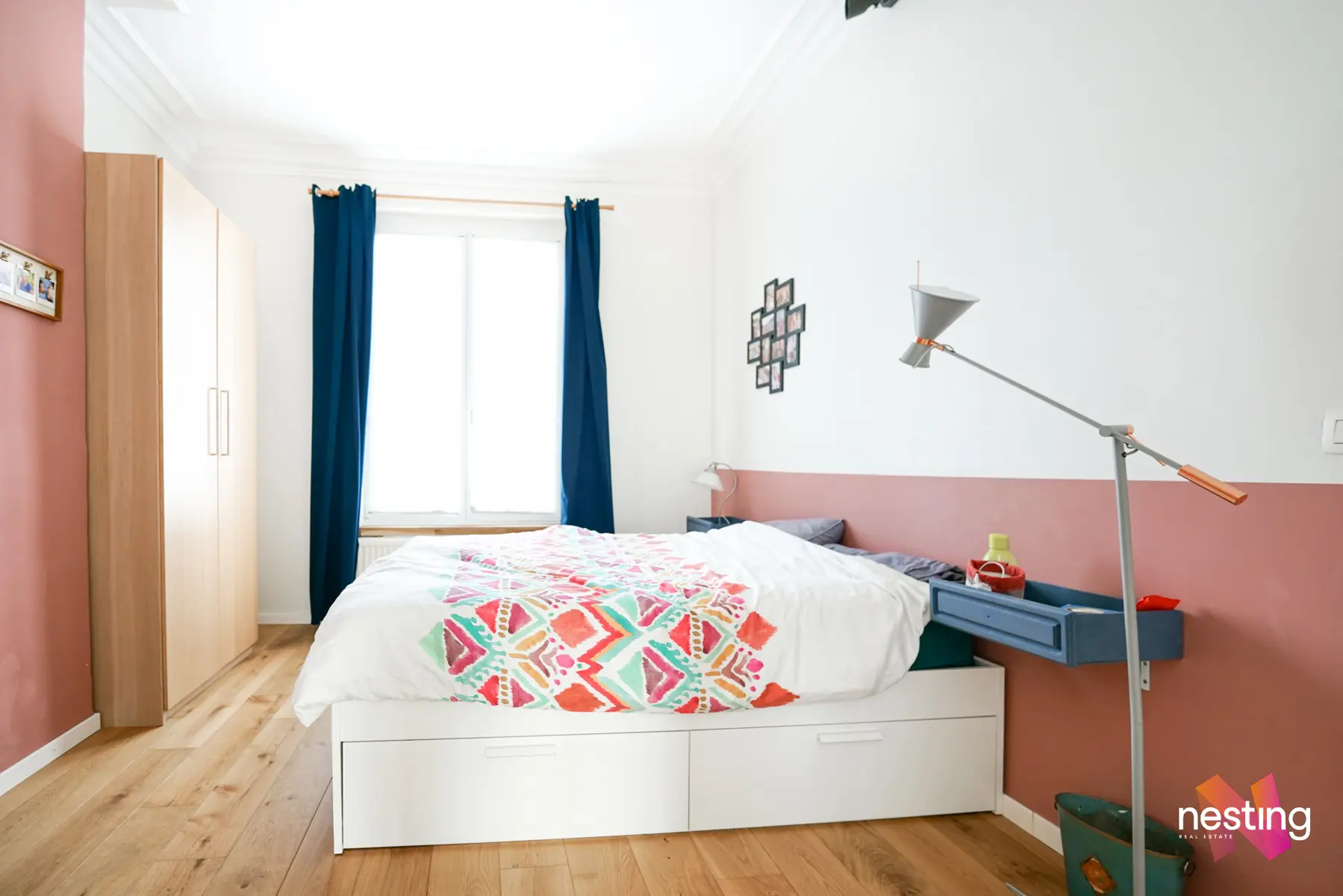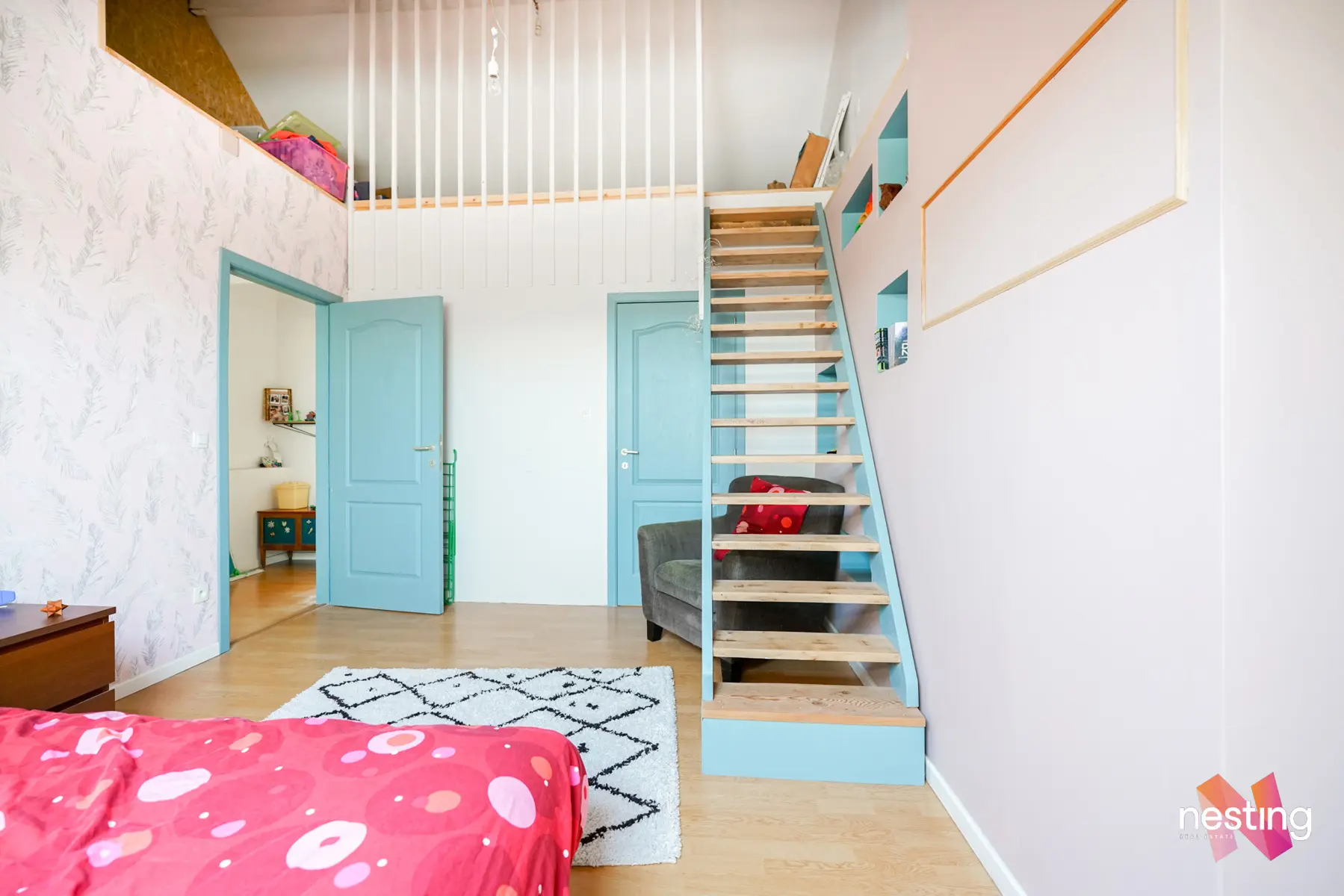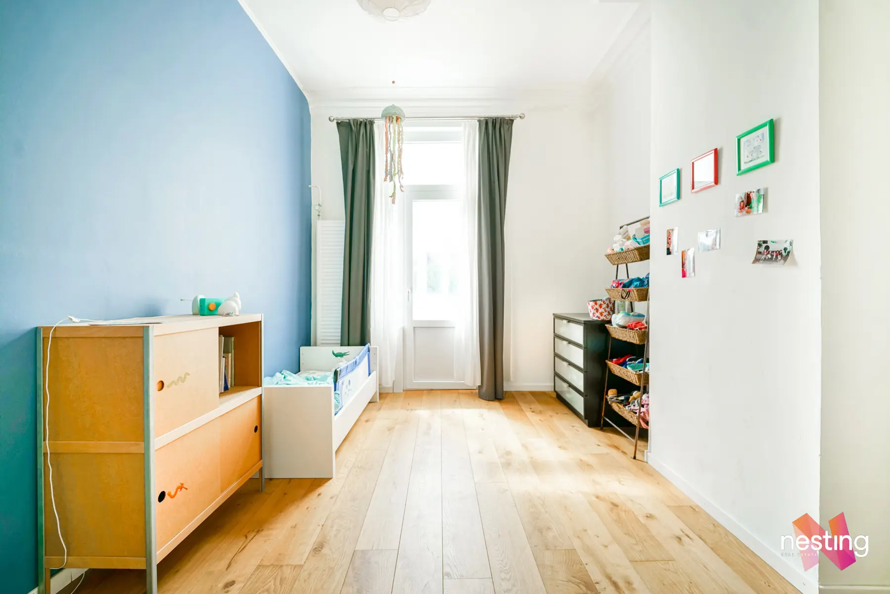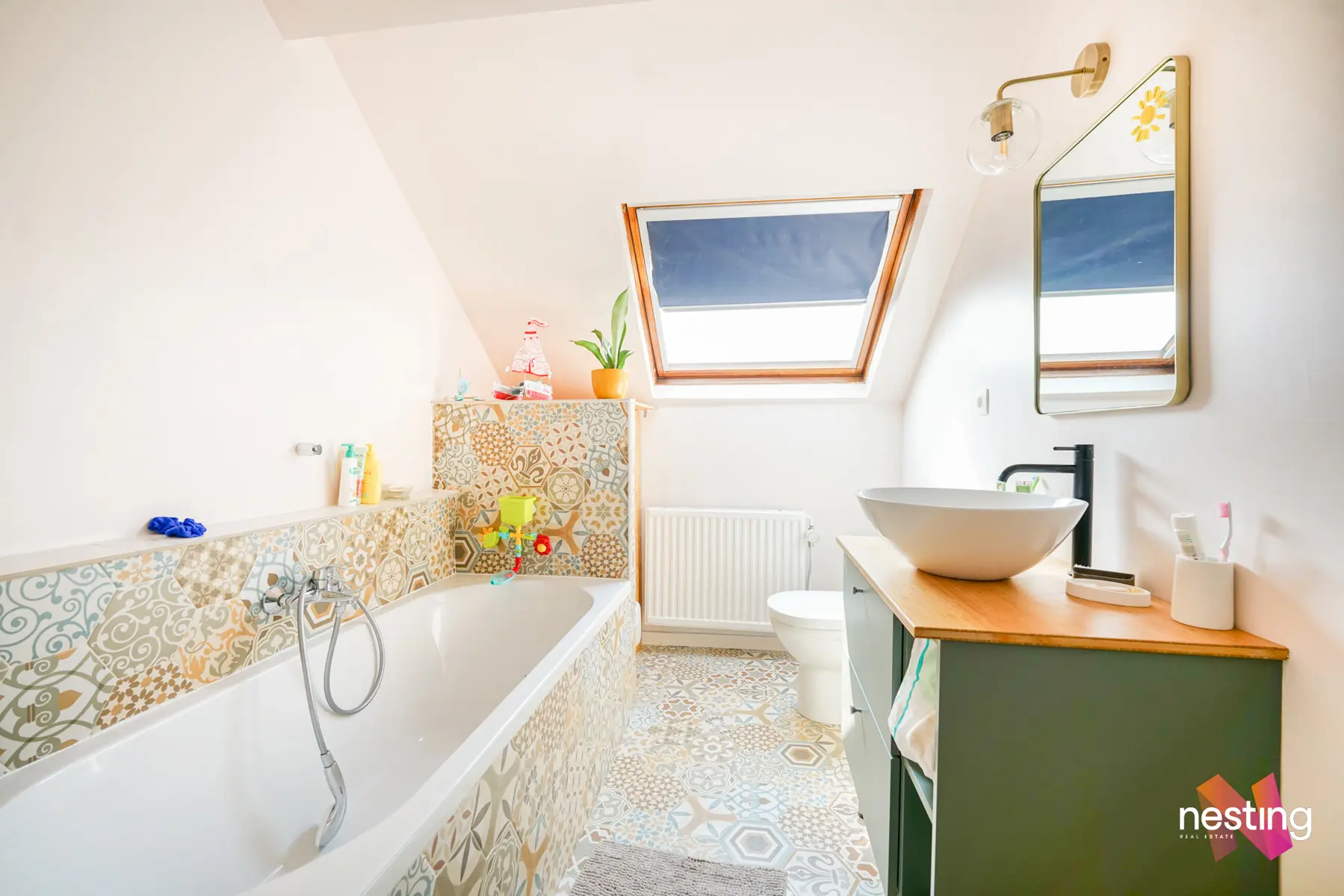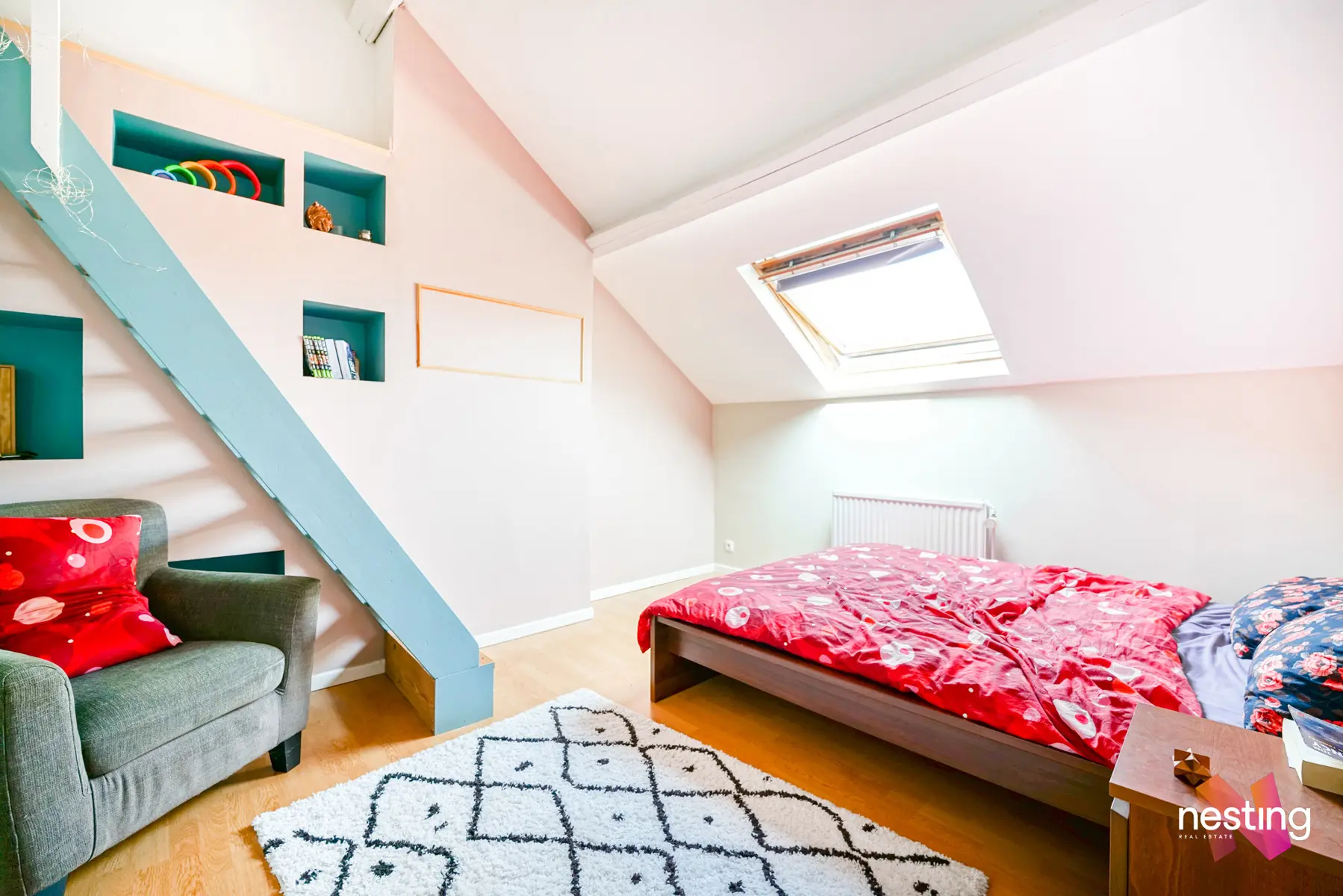 Au 2e étage : 2 chambres (+- 15,5 avec une mezzanine et 13) et une salle de bains avec wc.