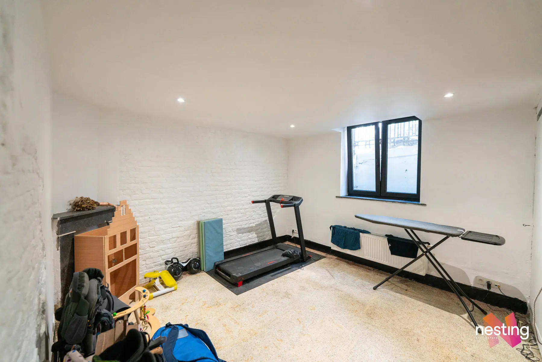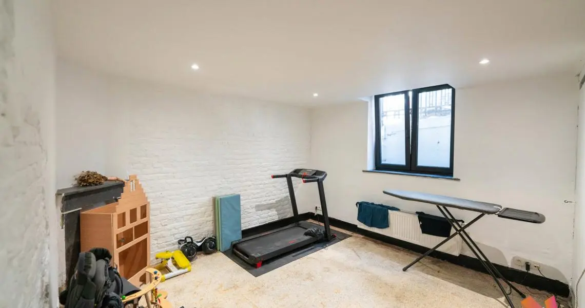 Sous-sol : un espace polyvalent de près de 90 m² comprenant un atelier avec buanderie et chaufferie, un cellier (6 m²) et une pièce annexe de 15 m² donnant sur rue, actuellement aménagée en salle de sport.