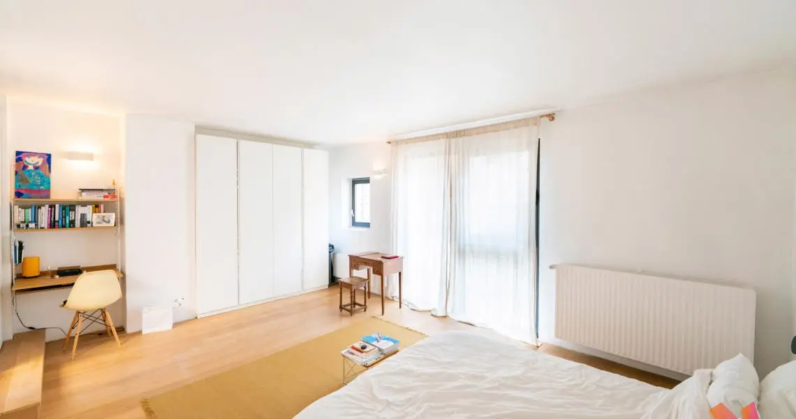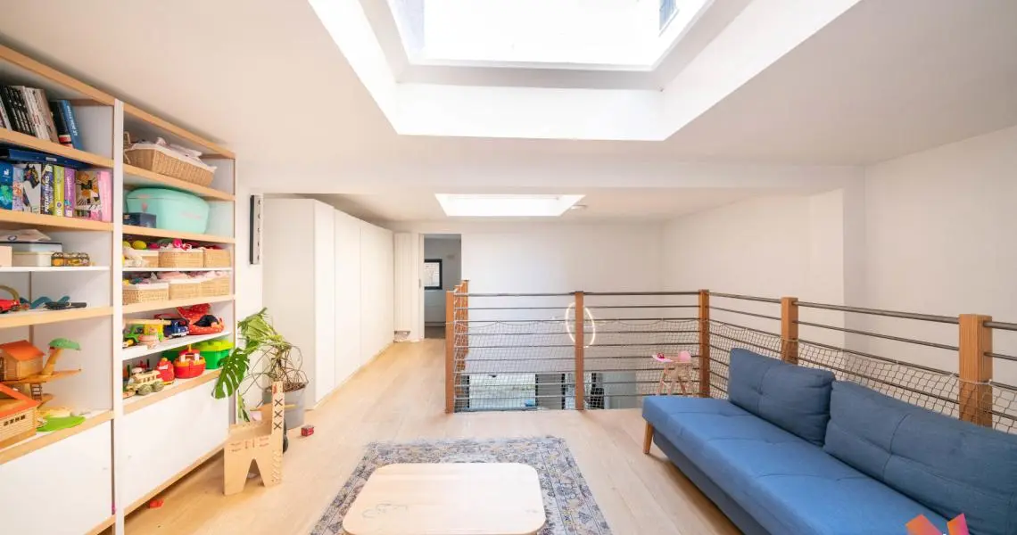 Étage : une belle mezzanine de 27 m² surplombe le séjour et mène à deux grandes chambres (23 m² et 17 m²), ainsi qu’à une salle de bain complète avec double lavabo, baignoire, douche et WC.