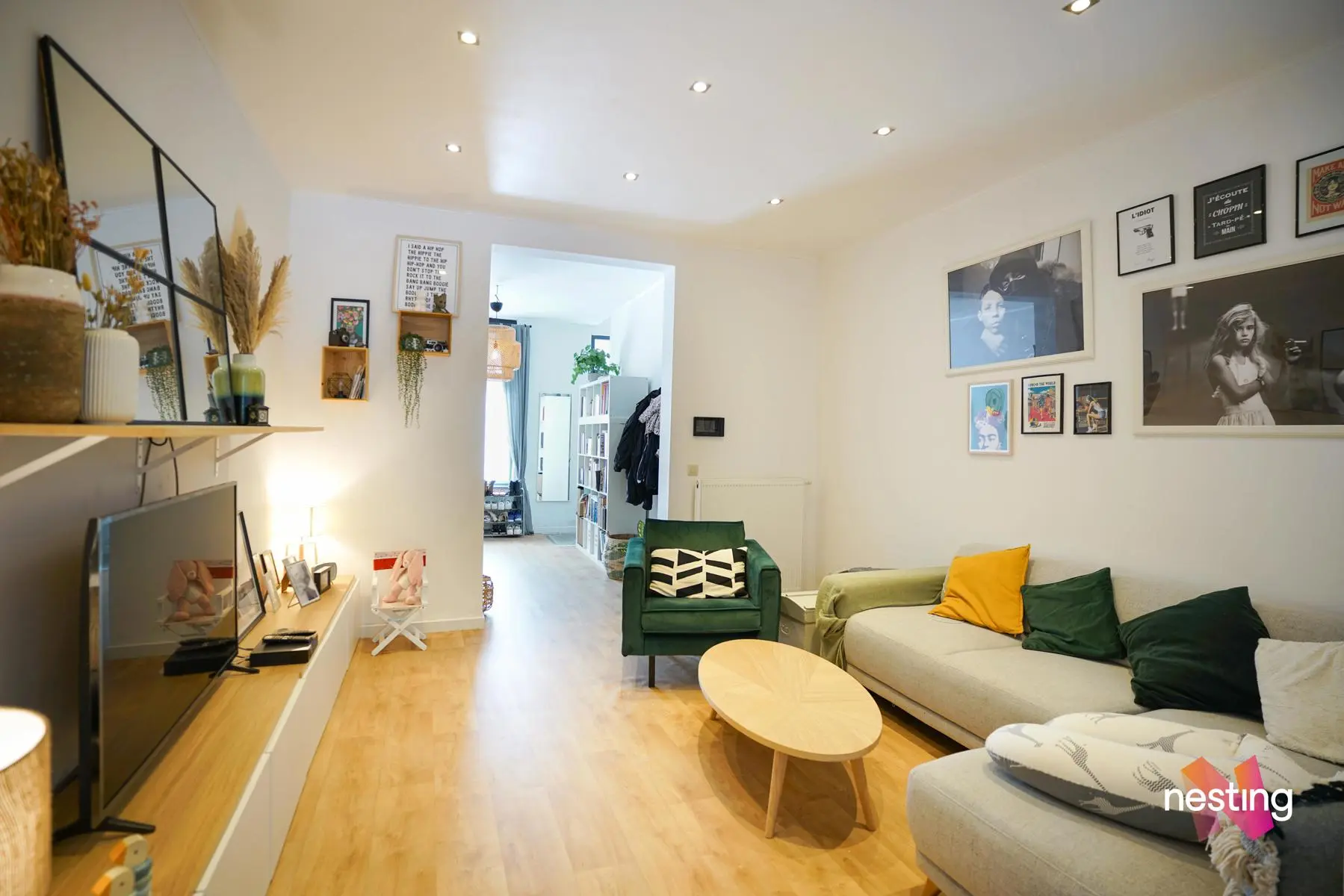 au Rez : hall d’entrée, bureau, salon salle à manger, toilette séparée, cuisine US super-équipée, donnant sur la terrasse et le jardin de +/-260m2 ensoleillé toute la journée !