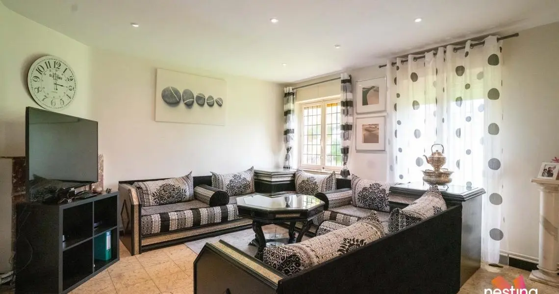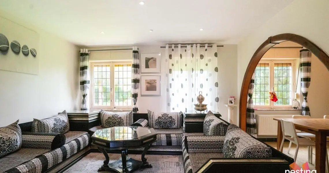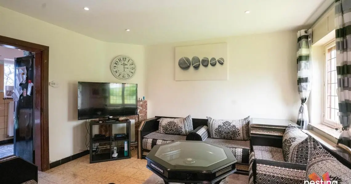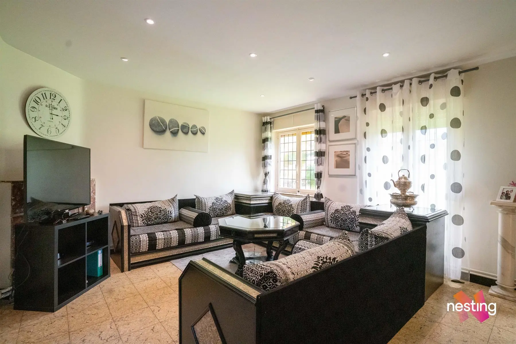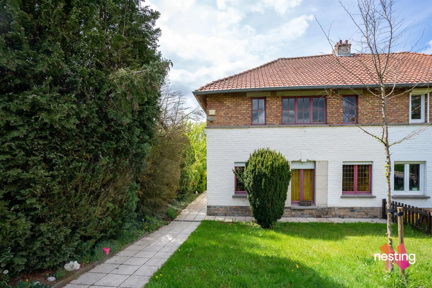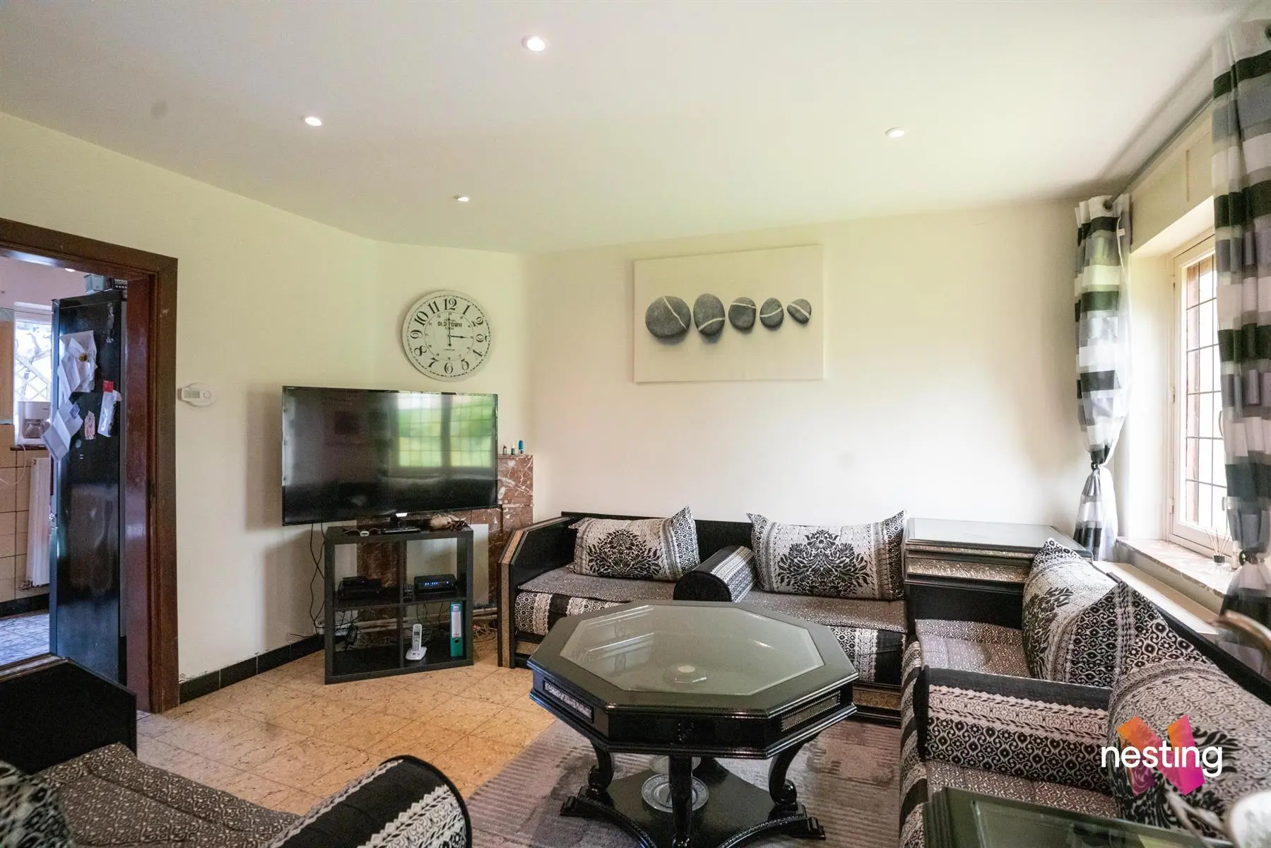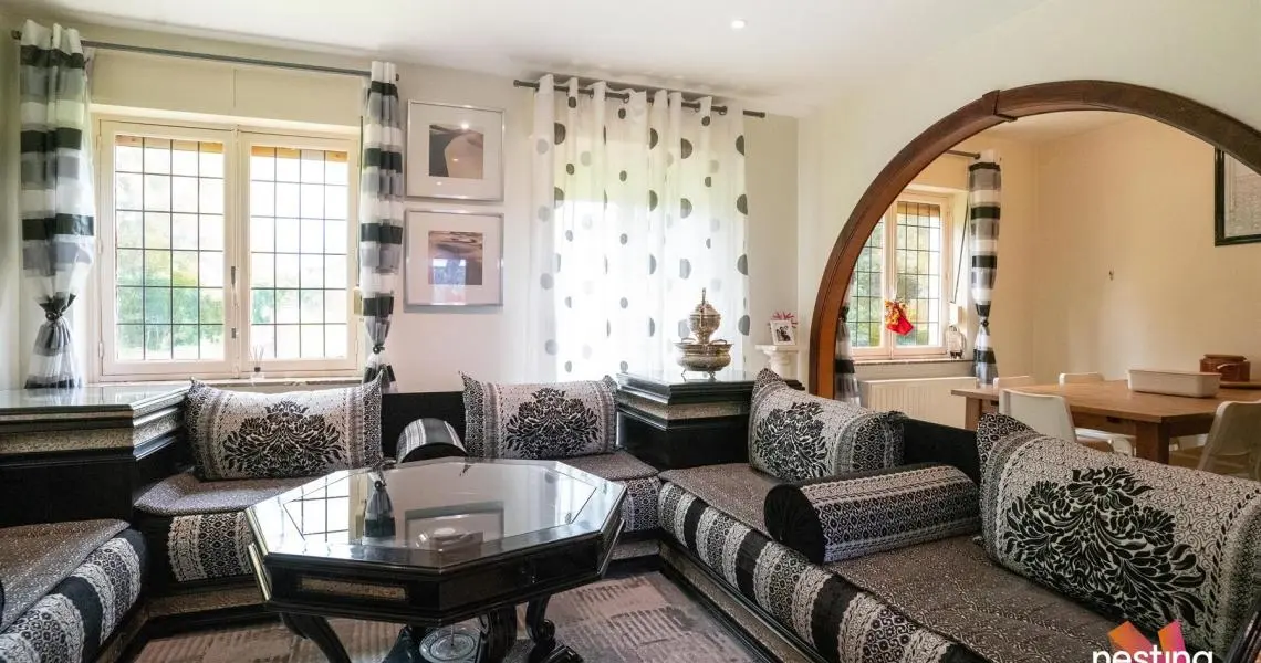 au Rez : hall d'entrée avec vestiaire et wc séparé, salon et salle à manger, cuisine équipée donnant sur la terrasse et le jardin de +/-690m2 orienté ouest / sud-ouest