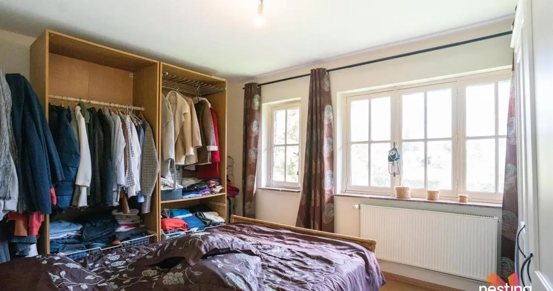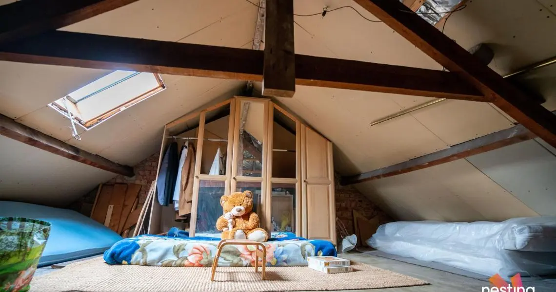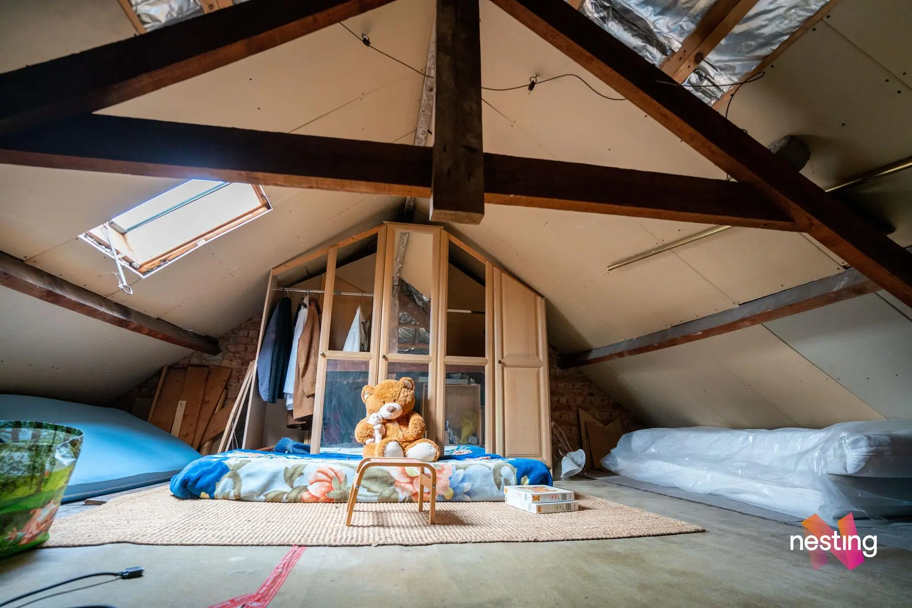 Au grenier, espace de +/-28m2 sous combles servant de rangements mais pouvant être transformée en chambre supplémentaire.