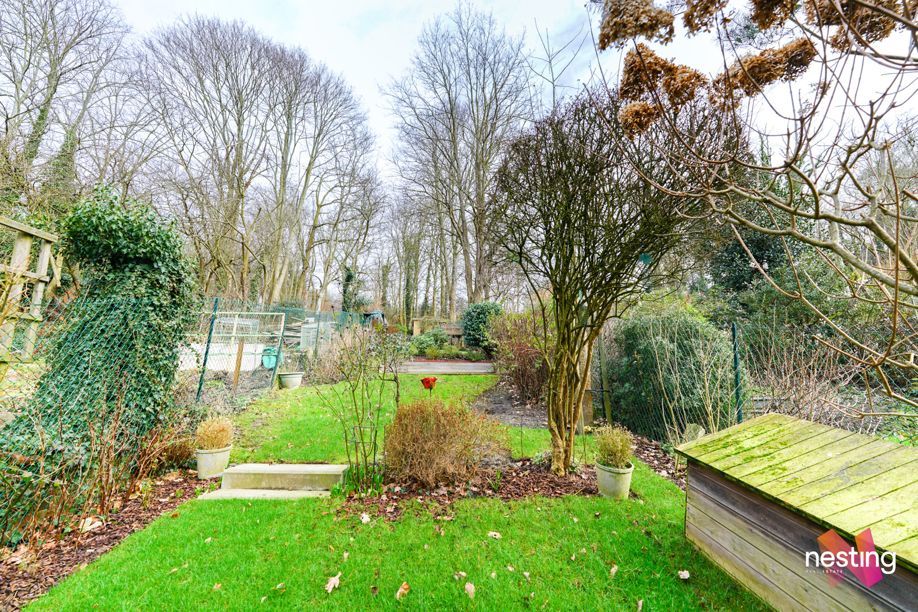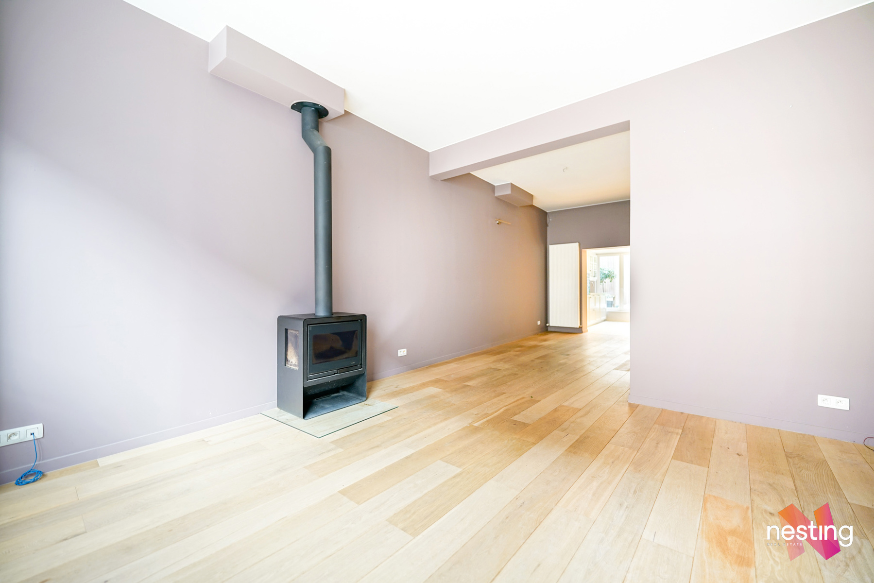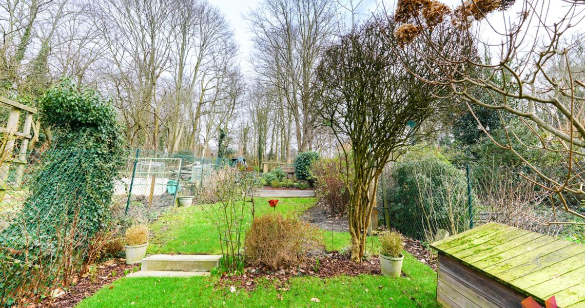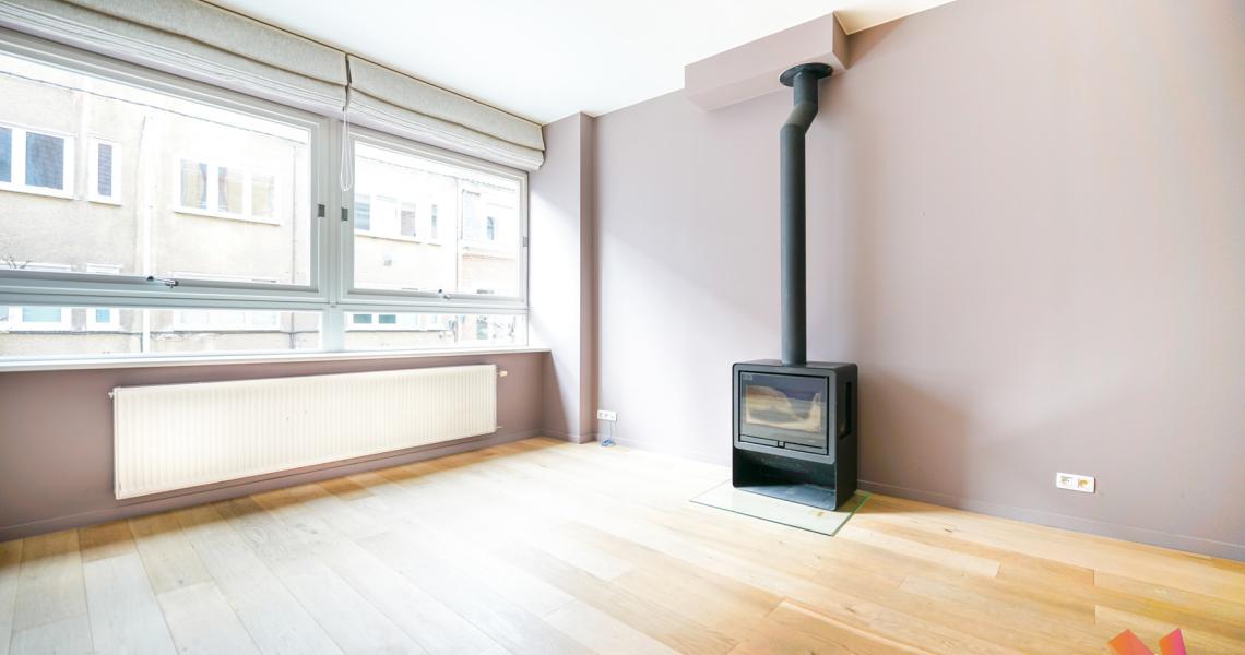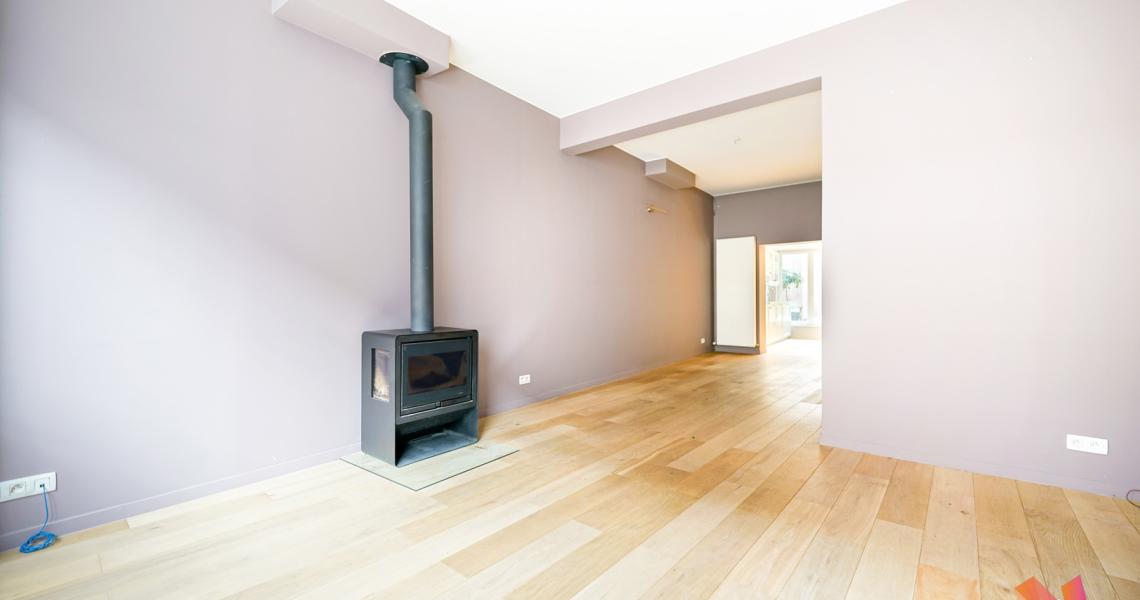 Au 1er étage : une grand séjour de +- 25 m²avec un feu au bois, une cuisine super-équipée donnant accès à une terrasse, une véranda et un grand de jardin.