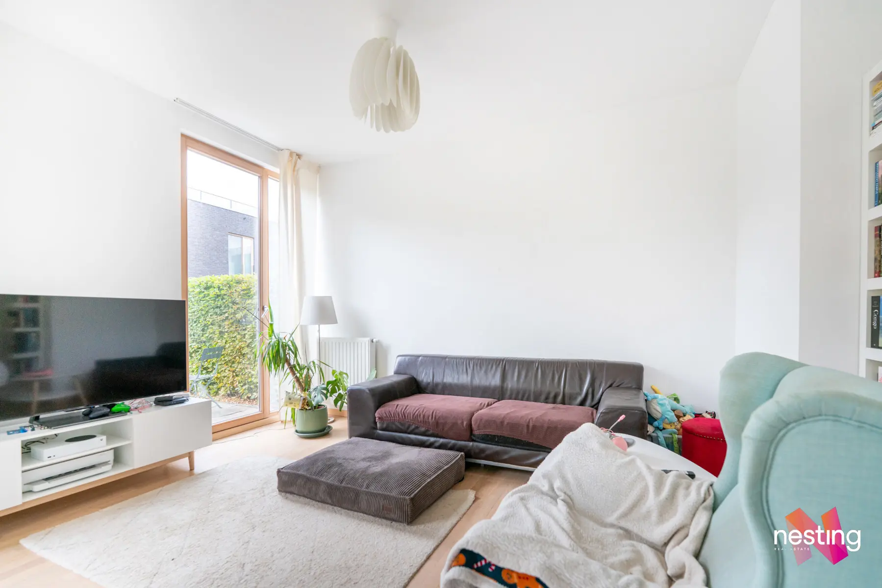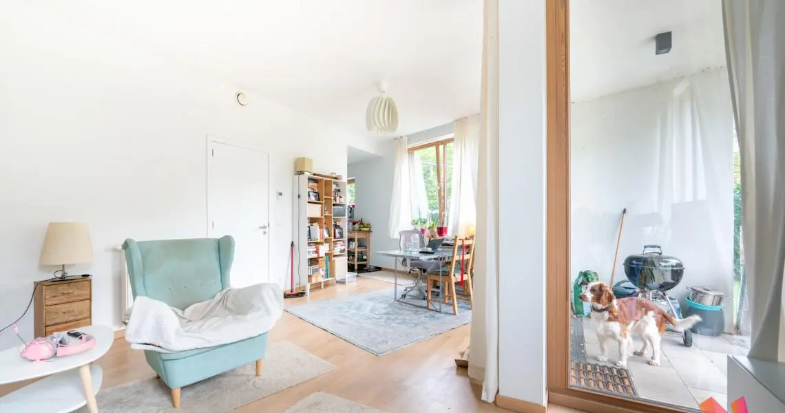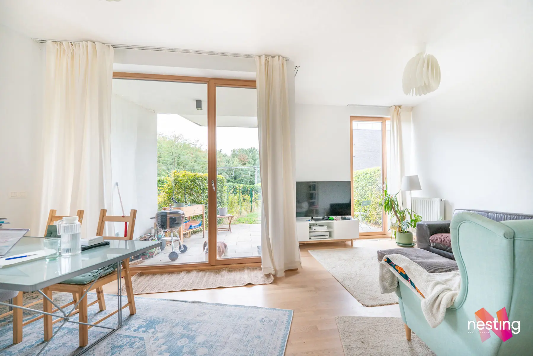 Hall d'entrée, séjour de +/-30m2 donnant sur la terrasse et le vaste jardin orienté sud-ouest, cuisine US super équipée, hall de nuit, 2 chambres (12m2 et 15m2), salle de bains, buanderie et wc séparé.