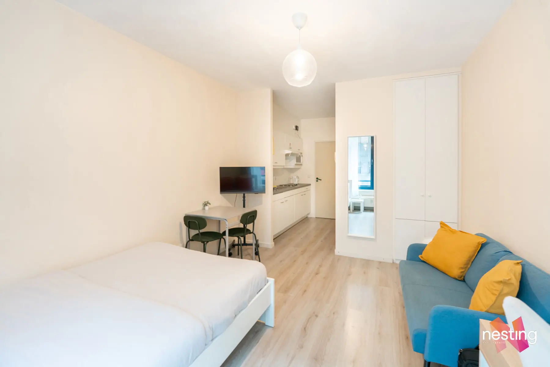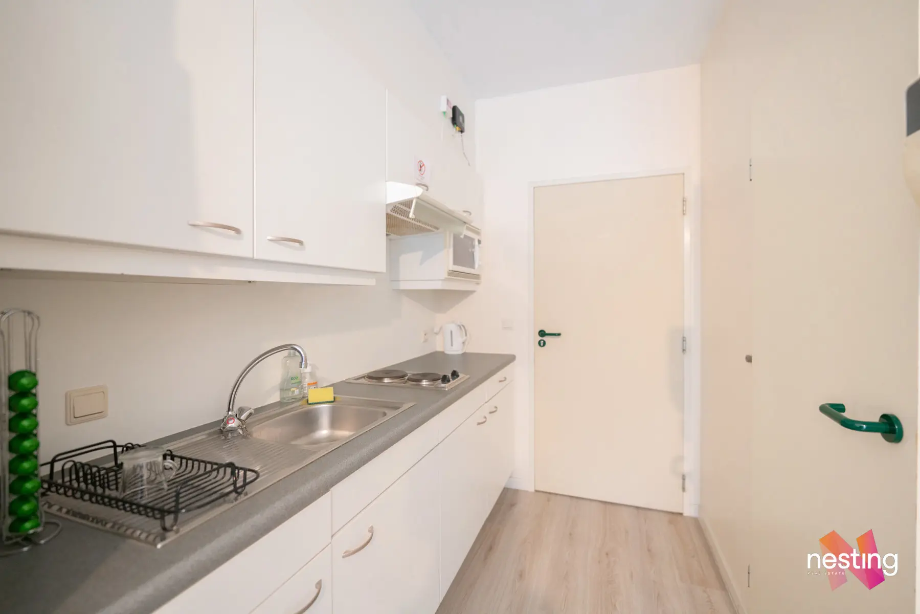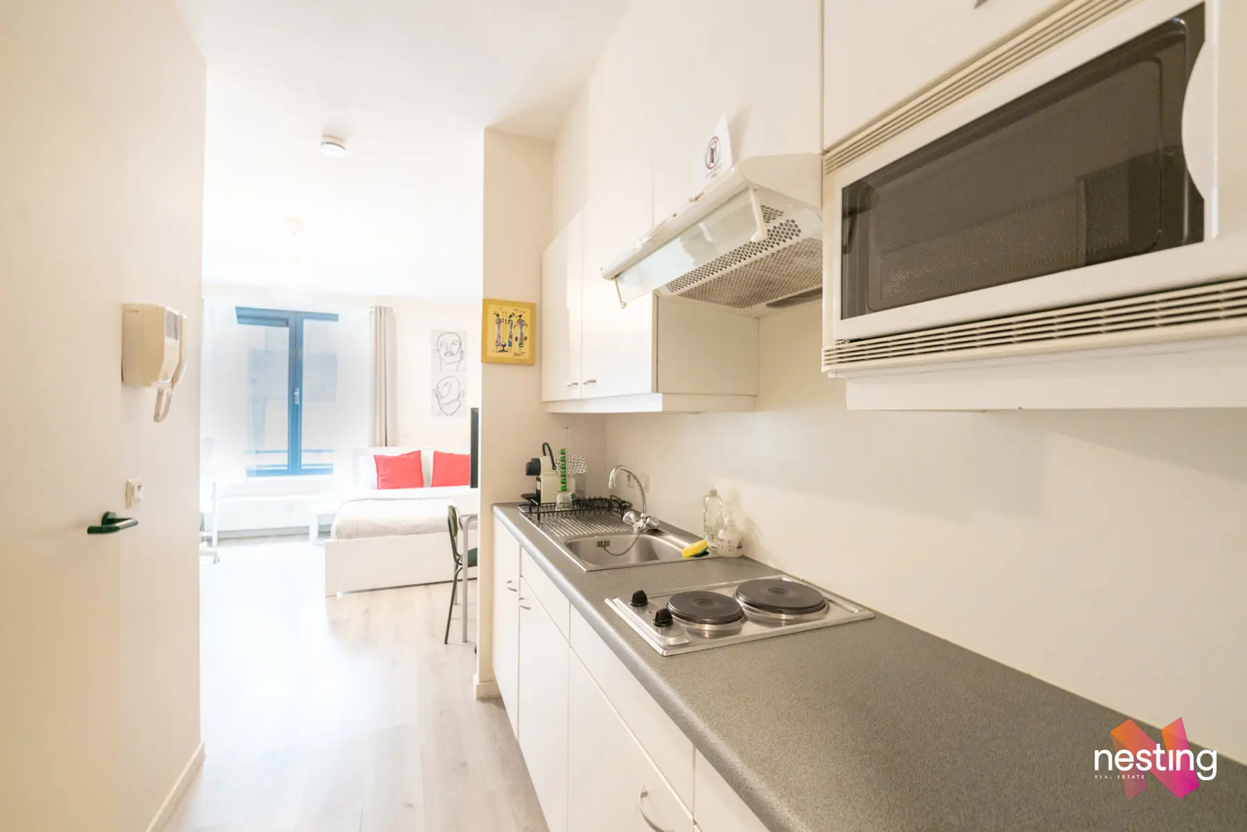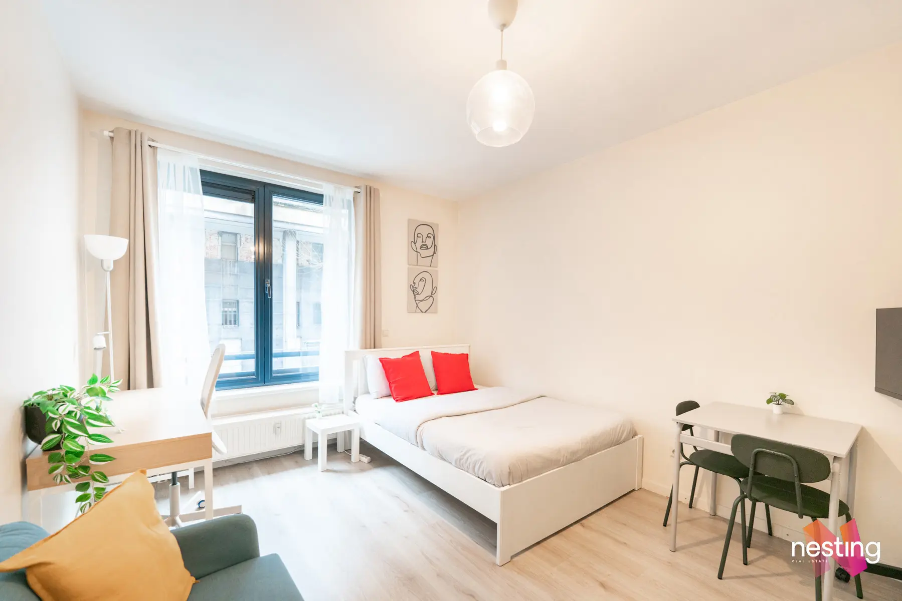 Bruxelles, rue Saint-Laurent, idéalement situé à deux pas de la rue Neuve, studio lumineux de 20 m2 au 1er étage offrant une salle de douche avec wc, une cuisine et un séjour/chambre.