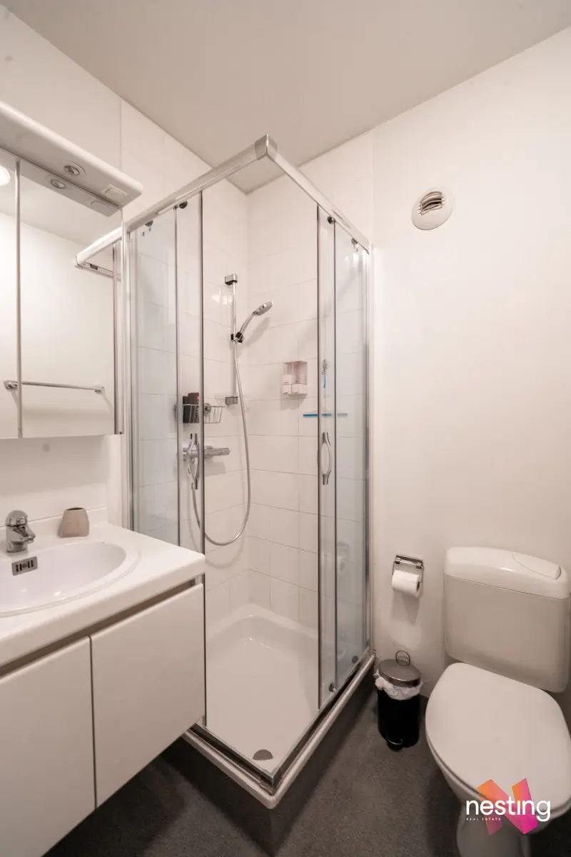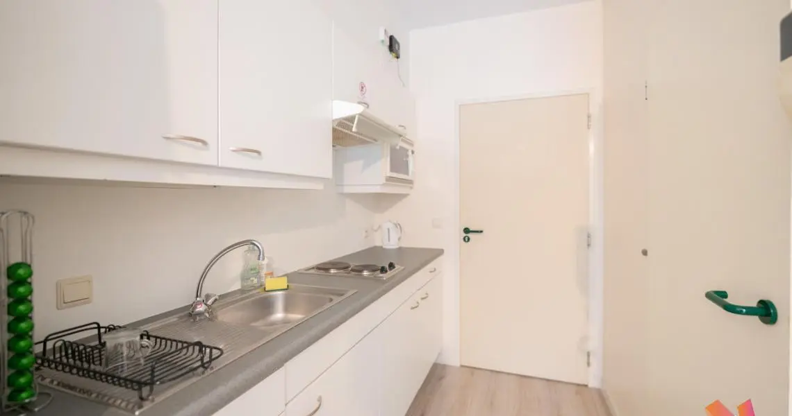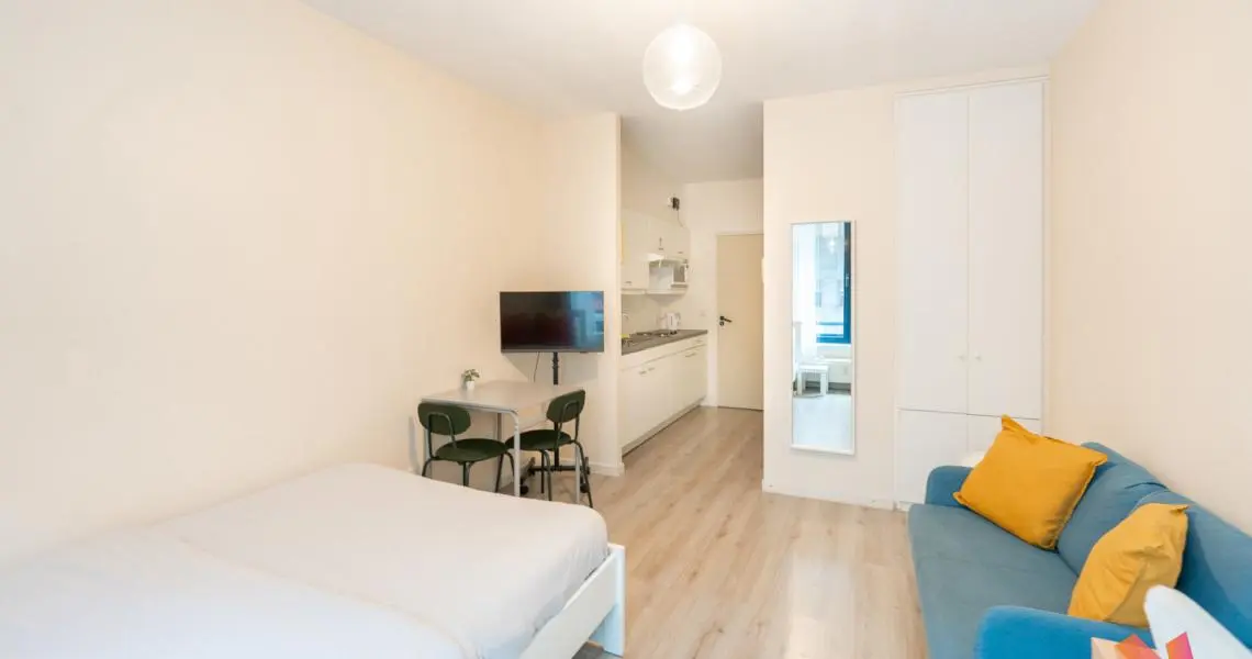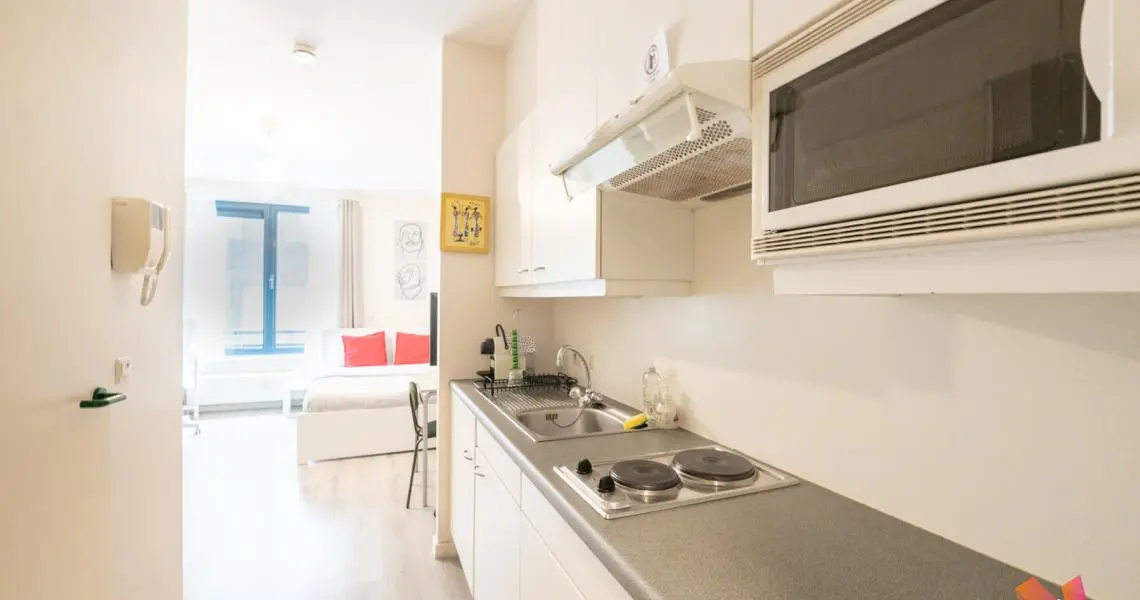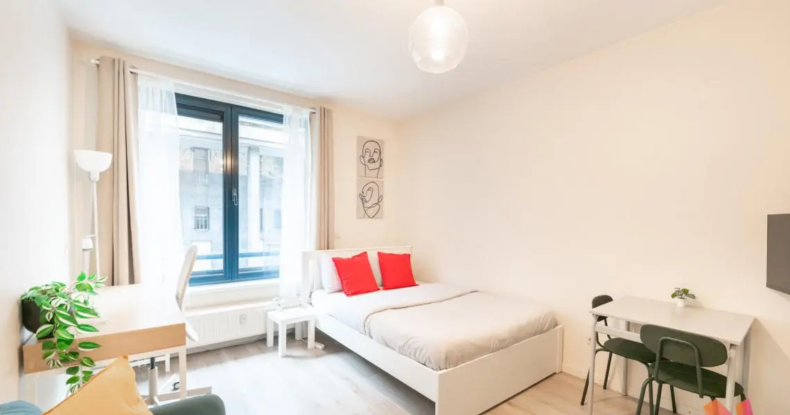 Bruxelles, rue Saint-Laurent, idéalement situé à deux pas de la rue Neuve, studio lumineux de 20 m2 au 1er étage offrant une salle de douche avec wc, une cuisine et un séjour/chambre.